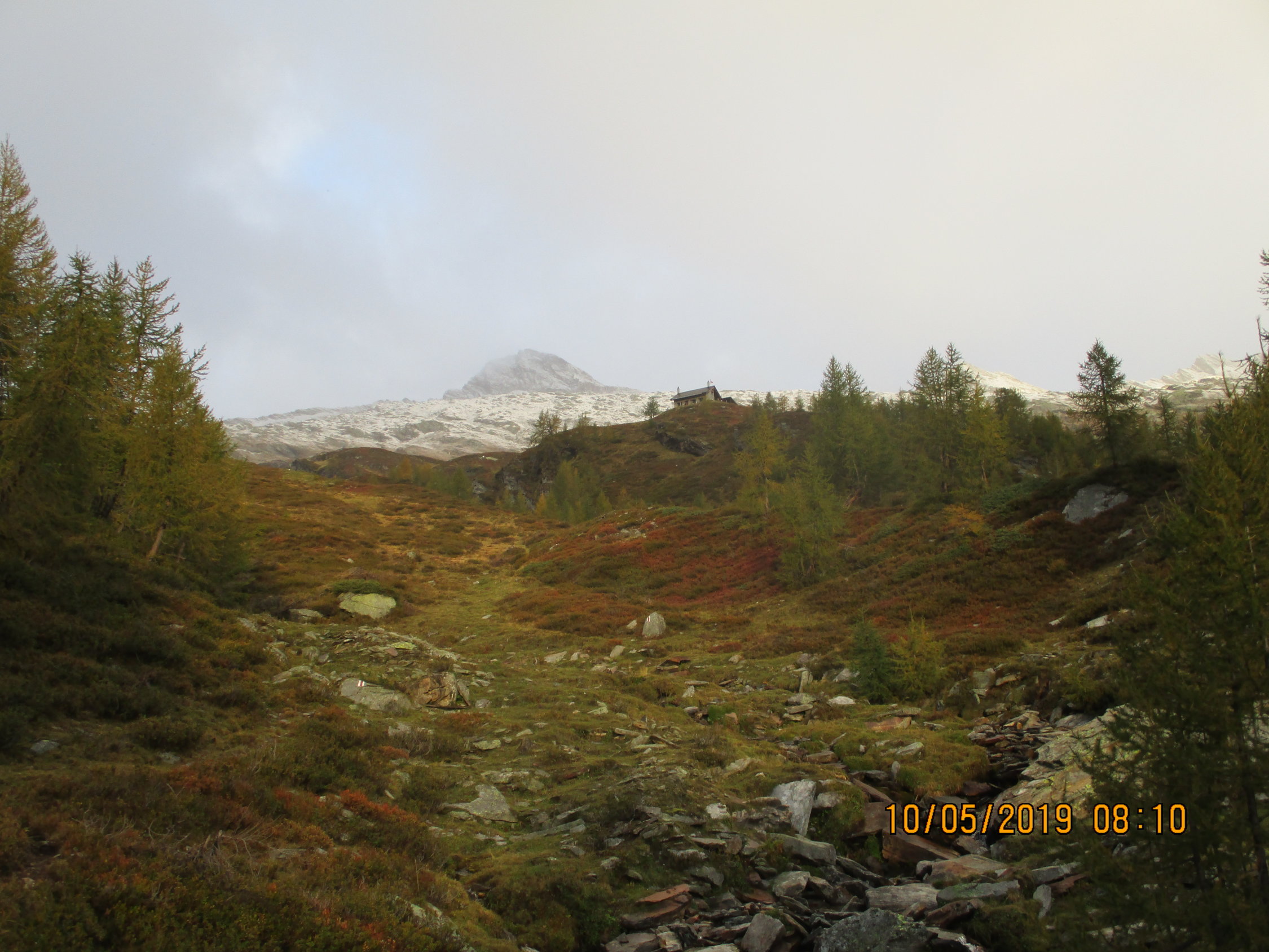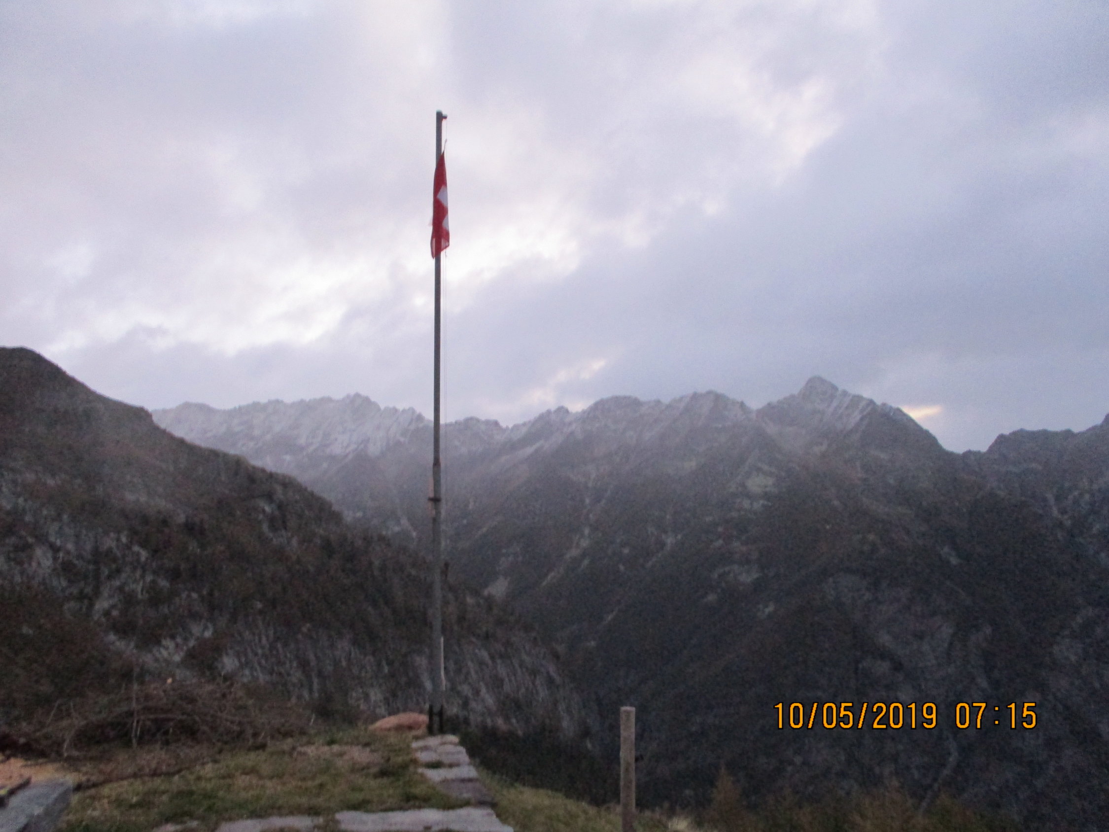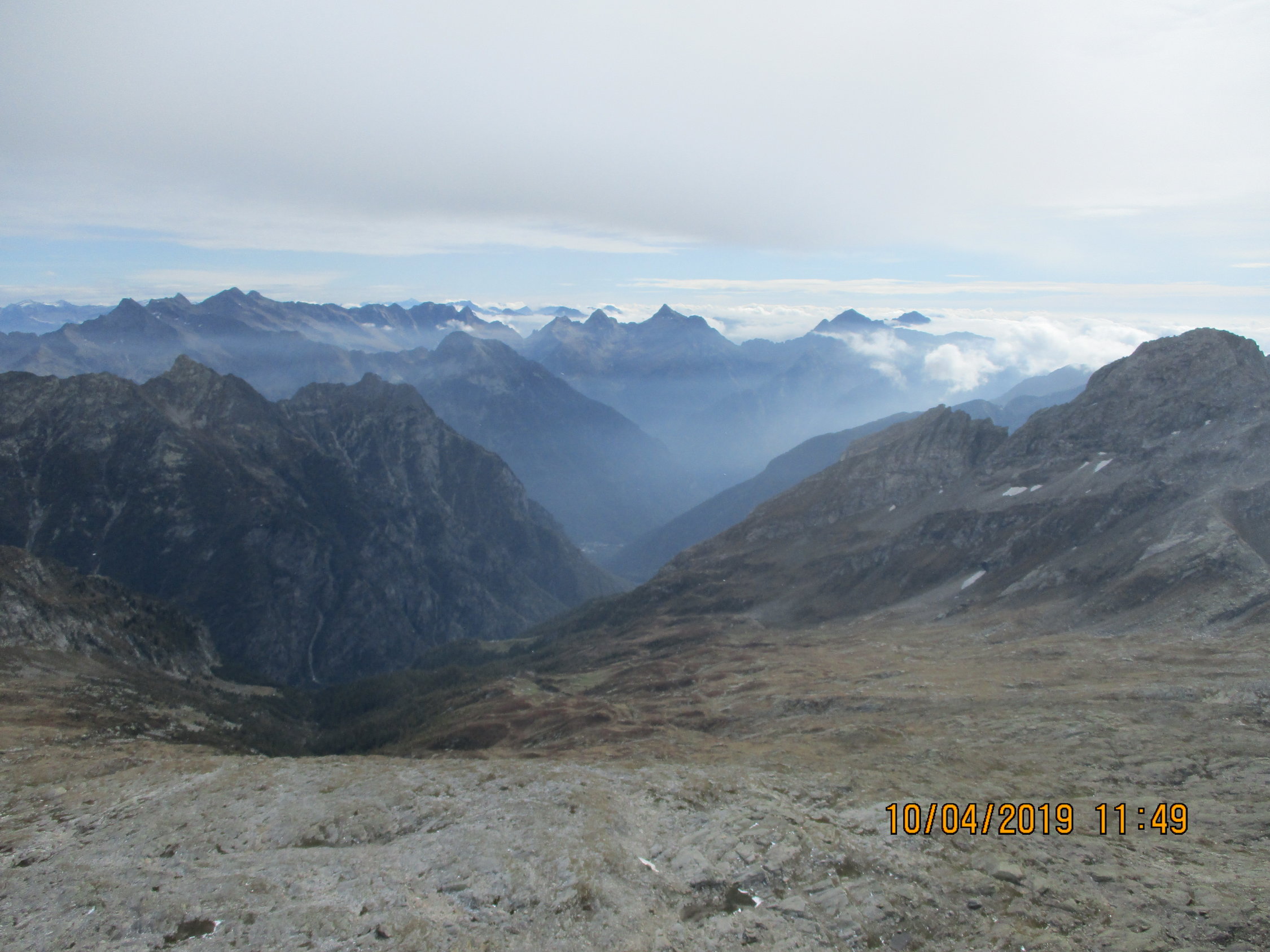 nach einem phänomenalen frühen Morgen zog rasch ein Wolkenschirm aus West und Nordwest auf, der sich in der Folge verdichtete und die Sonne nur noch sparsam durchkommen ließ. Gegen Ende meines Gipfelaufenthaltes zog dann eine Ladung tief fliegenden Gewölks von Nordwest herüber. Als der nahe Basòdino davon ergriffen wurde, blies ich zum Rückzug, und noch während des Abstieges wurde auch der Poncione di Braga von diesen Wolken erfasst und über längere Zeit hinweg von diesen nicht mehr losgelassen. Minimaler Schneefall setzte ein, und es wurde windig und kalt. Am späten Nachmittag, ich war schon längst unten im Rifugio Poncione di Braga, besserte sich das Wetter nochmals, um über die folgende Nacht nochmals mit gleichfalls geringen Niederschlägen zuzuziehen. Am nächsten Morgen war das Wetter wiederum perfekt.