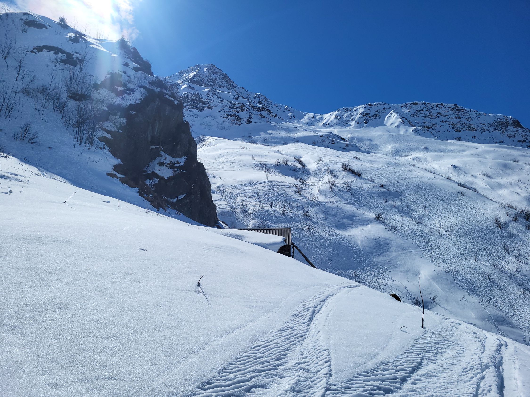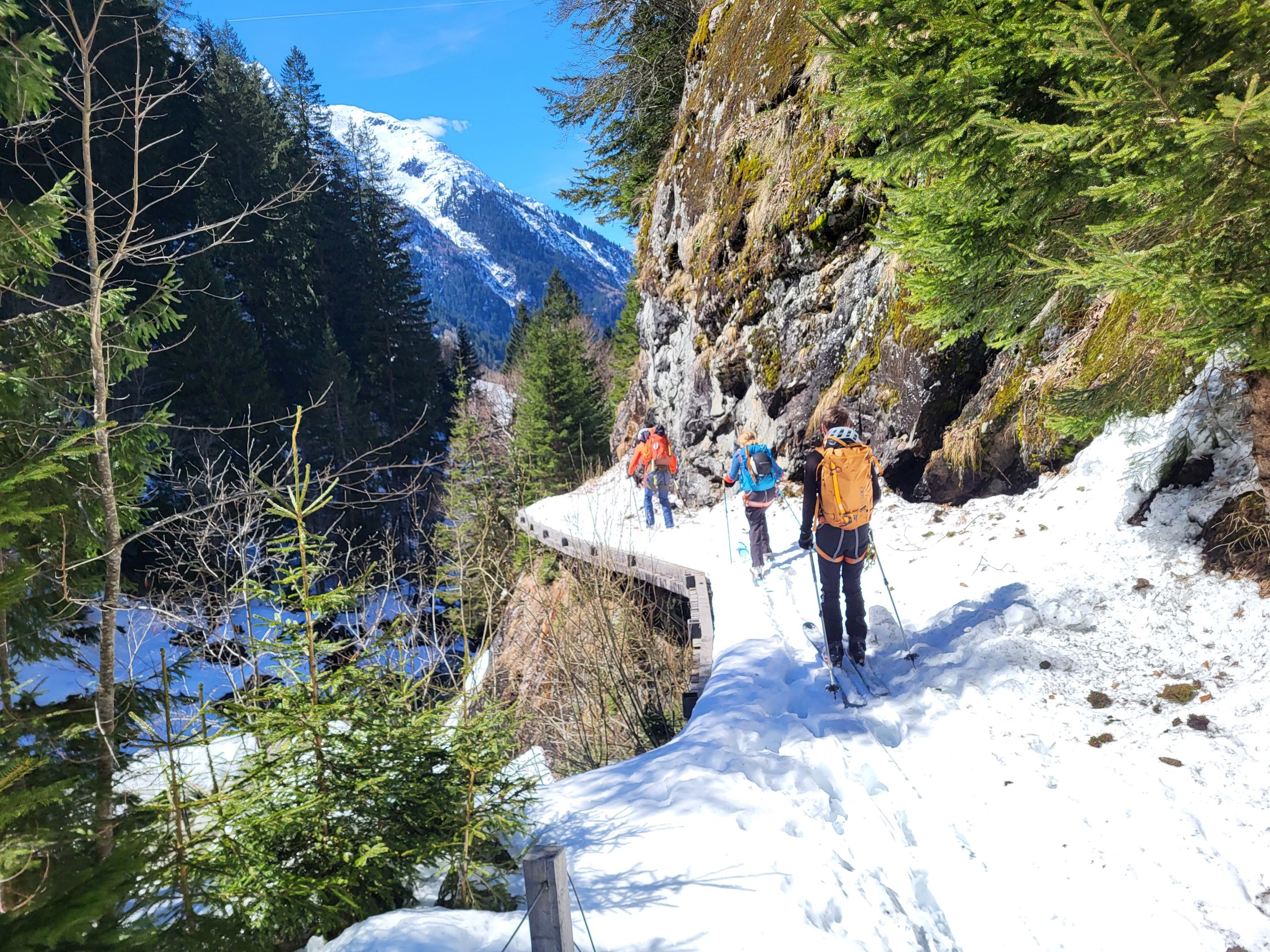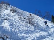 In der Abfahrt auf dem Staldenfirm war der Schnee eher mühsam zu fahren (Bruchharsch). In der Gemsplannge war der Schnee hart, aber griffig. Das sehr steile Stück unterhalb Milchplanggen war schwierig, wir sind am Seil abgerutscht. Im Tal hat es noch Schnee bis kurz vor Pt. 917.
