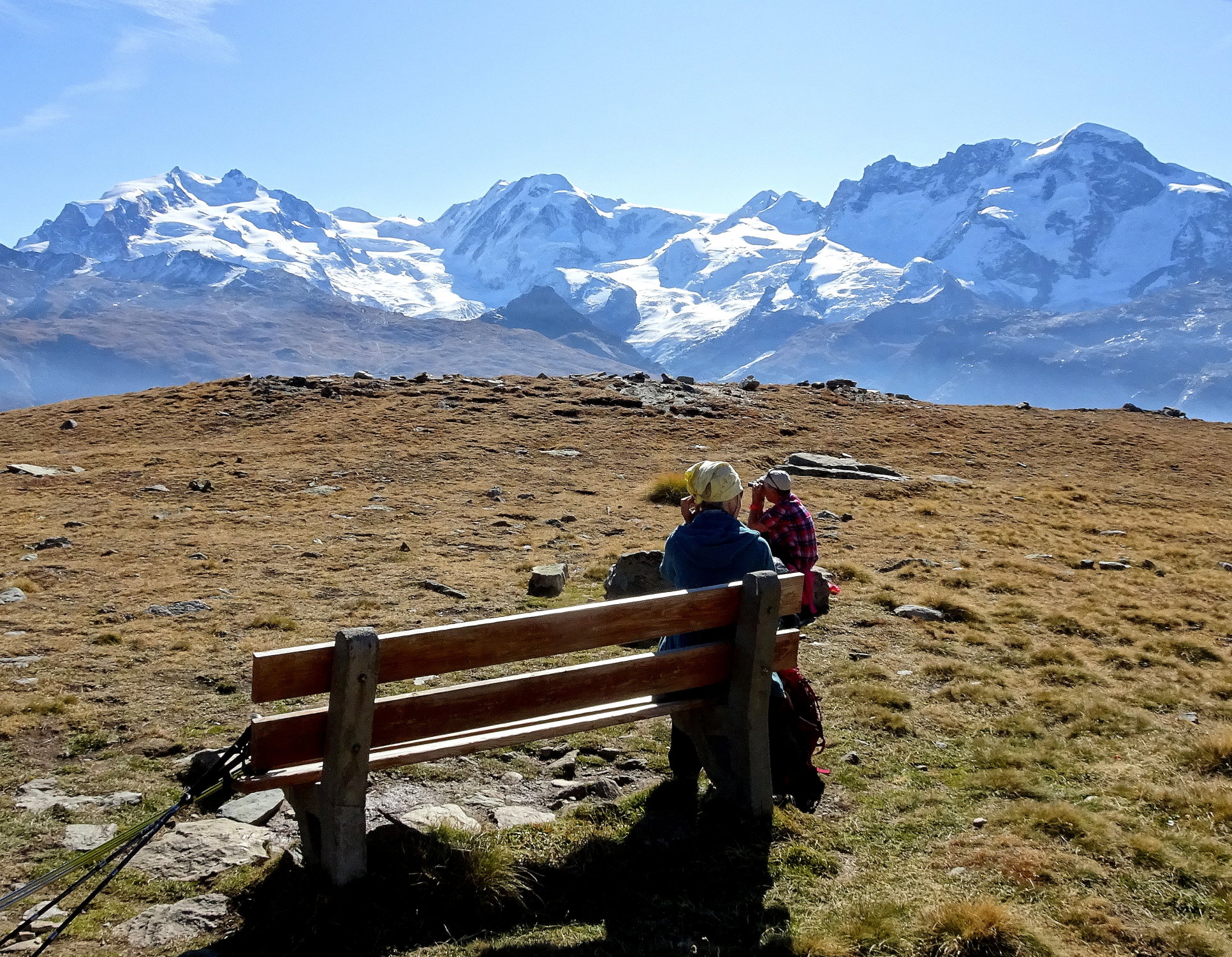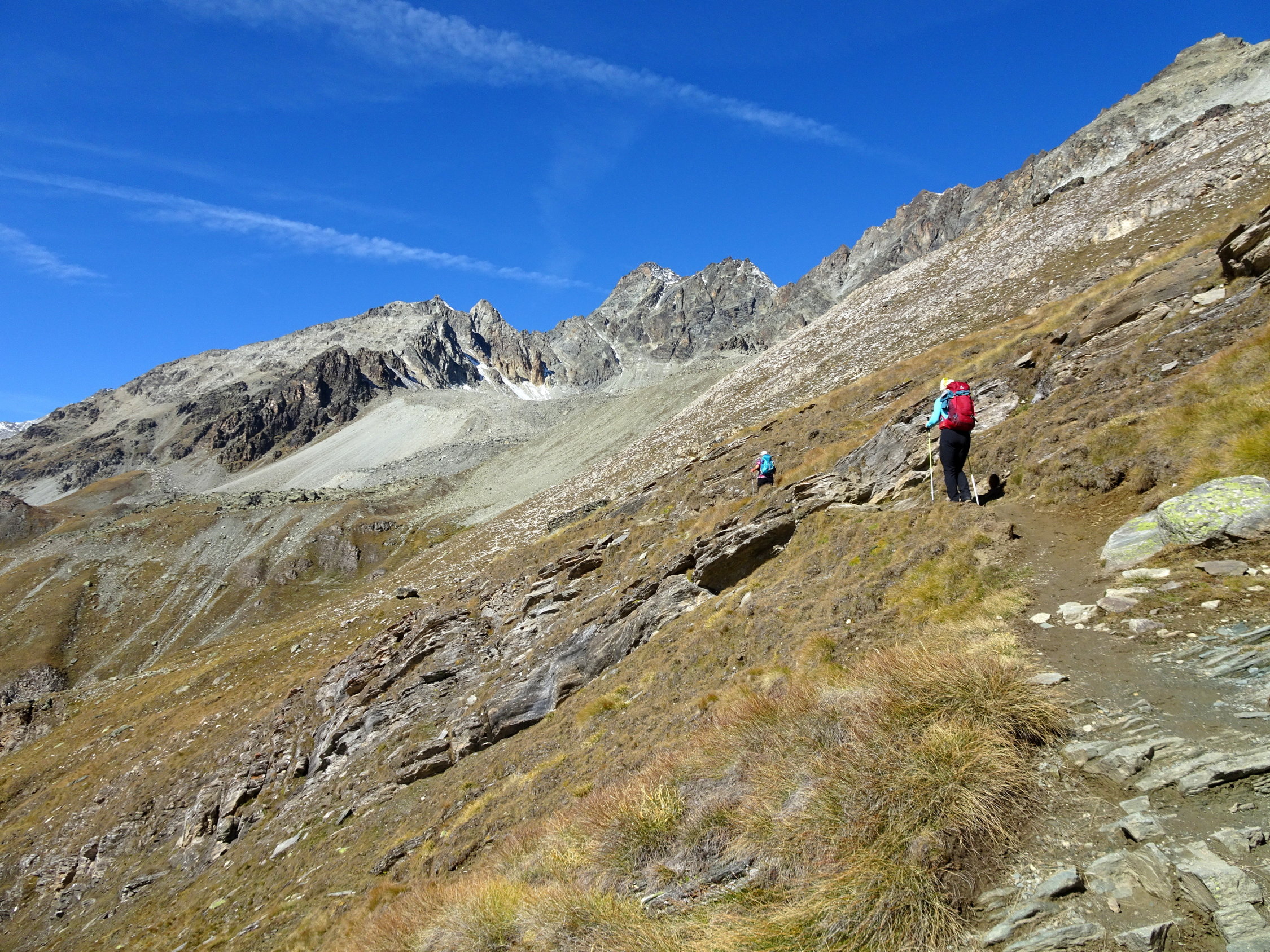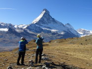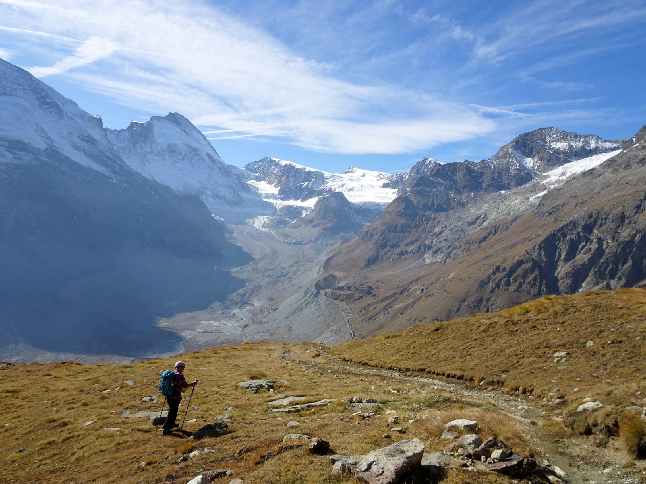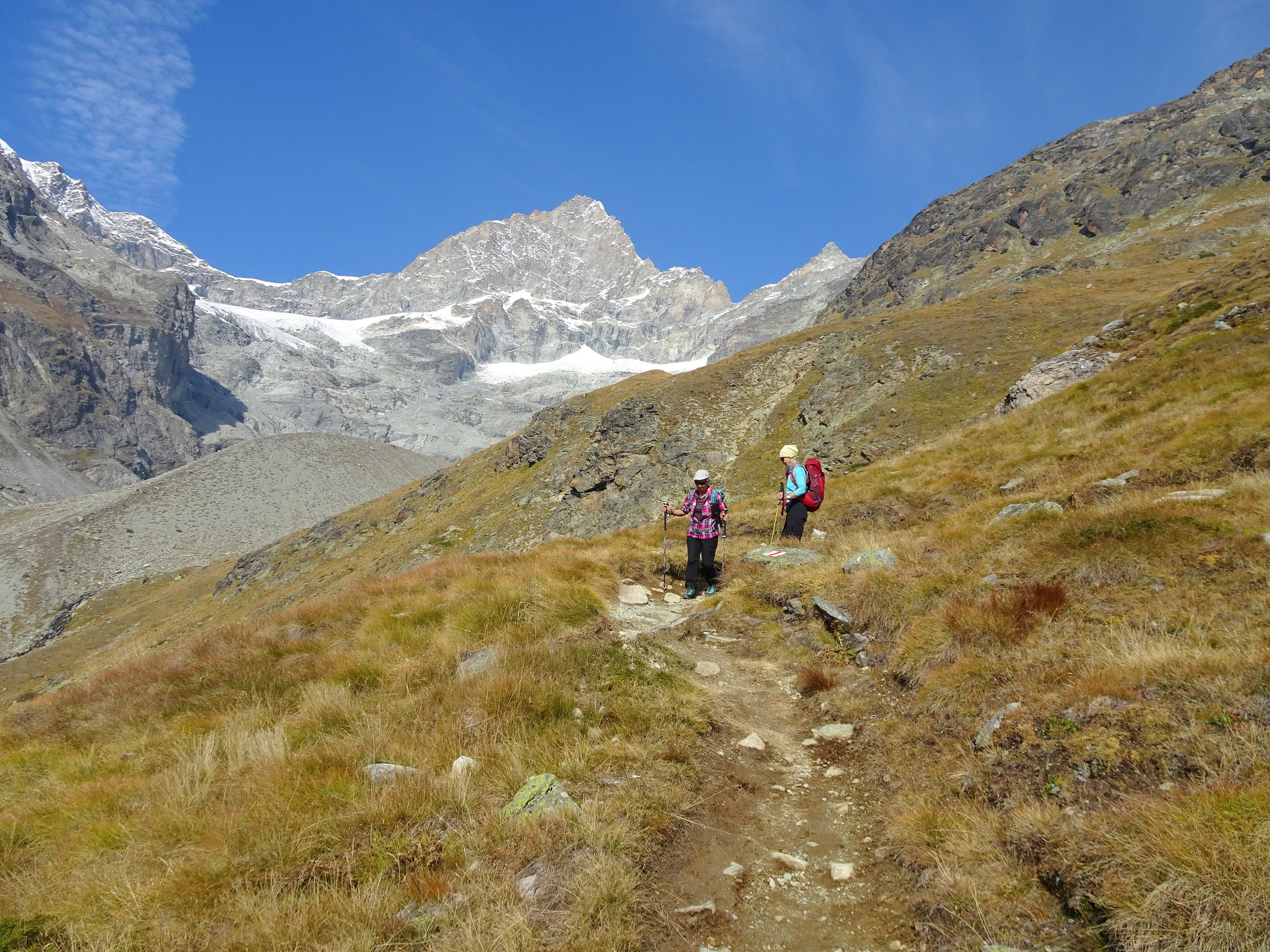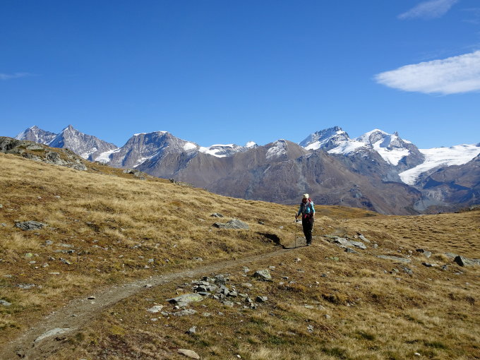 Dasselbe Erlebnis innerhalb vier Tagen. Was man vor Jahren "gemacht" hat, erscheint heute steiler, länger und mühsamer was eine normale Erscheinung ist. Wiederum dank der Routine kommt man durch und erlebt so einen wunderbaren Tag in guter Gesellschaft. Das war es wert! Allein der Blick aufs Matterhorn und Monte Rosa aus einer ungewohnte Perspektive hat den Tag zum grossen Erlebnis gemacht. Wer eine lange und zuweilen anstrengende Wanderung nicht scheut, sollte die mal machen, am besten im Frühsommer wenn es blüht. Der Weg wird auch als "Blumenerlebnis Weg" gepriesen.
