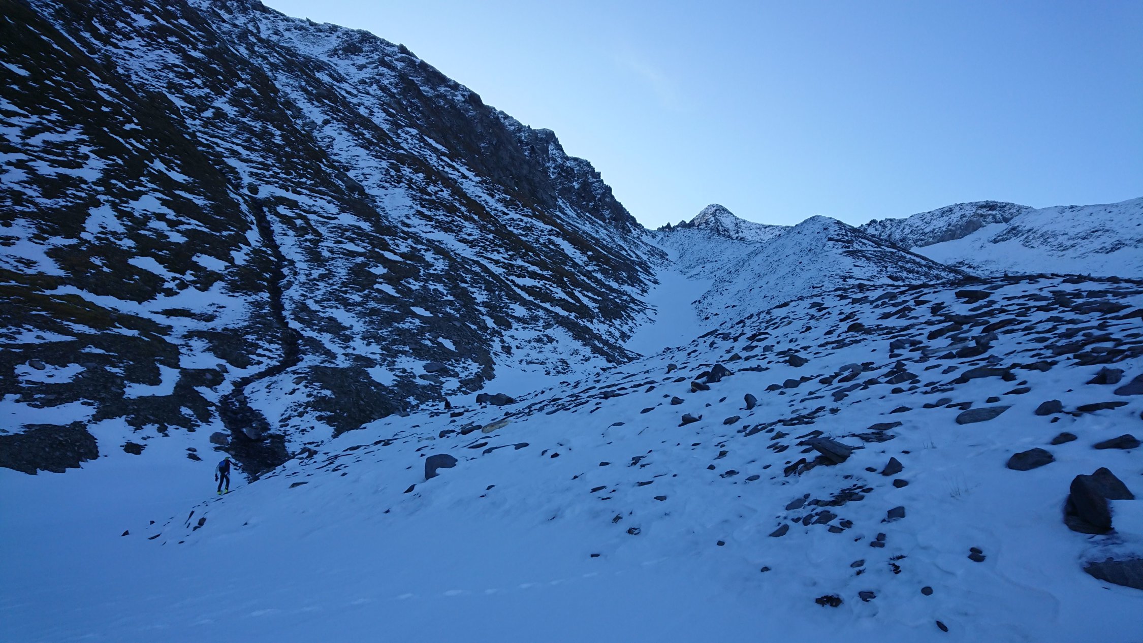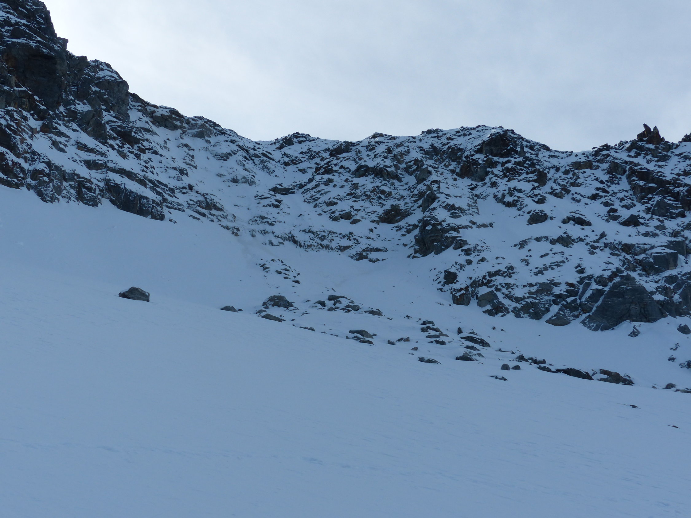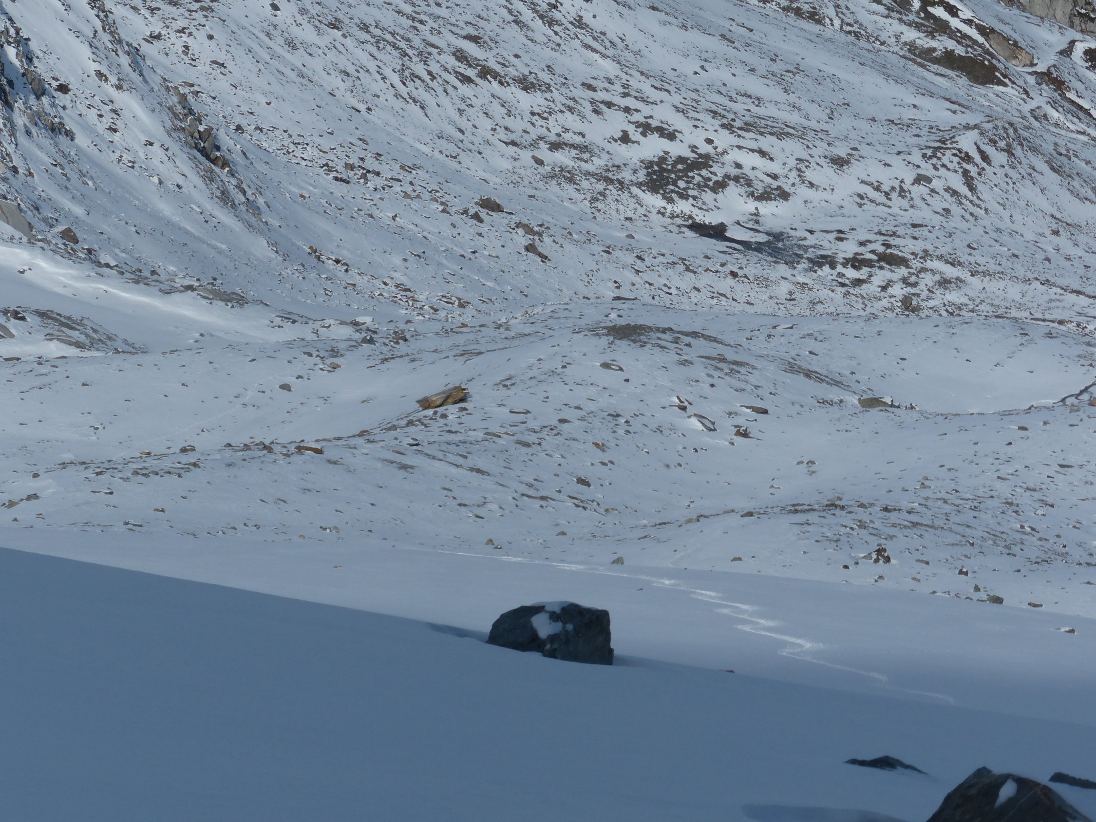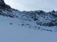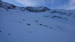 Wir haben die Tour beim Bergschrund - Nähe Skidepot - abgebrochen. Die Schneedecke ist da noch zu dünn, um ohne Risiko darüber zu laufen.Abfahrt: