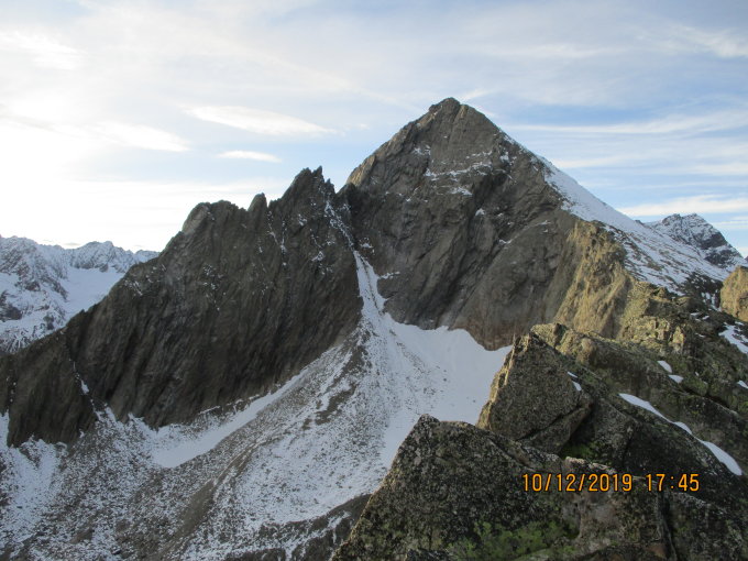 Der Fußabstieg vom Gipfel (auch nach dem Ausstieg aus der Ostwand möglich) ließ sich durch guten Trittschnee und bereits vorhandenen Spuren ganz ordentlich mit griffigen Zustiegsschuhen bewältigen. Die verhältnismäßig warmen Temperaturen sorgten dafür, dass Schnnee und potentielle Eisstellen zumindest ab den frühen Nachmittagsstunden nicht gefroren waren. Sollte e gefrieren, würden für den Abstieg Steigeisen nötig.