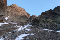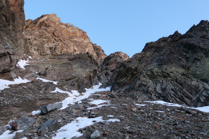 Anmerkung zum Couloir, welches zum SE-Grat führt (vgl. Bild): Es gibt mehrere Couloirs, welche auf den Grat hinauf führen. Wir haben uns im Dämmerlicht definitiv für das falsche (=linke) Couloir entschieden. Man kommt dann nicht in der Scharte, sondern etwas weiter oben auf den Grat. Das Couloir wird durch nasse Felsplatten mit einer Schuttauflage gebildet. Zudem ist der umgebende Fels äusserst brüchig. Von einer Begehung dieses Couloirs muss unbedingt abgeraten werden, da schwierig und gefährlich (schlaue Sicherungen sind nicht möglich). Unbedingt auf den Topos genau schauen, welches Couloir auf den Grat zu nehmen ist.
