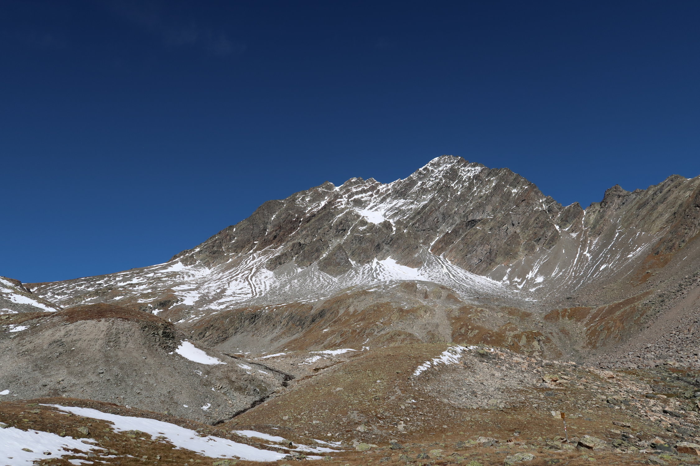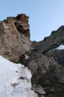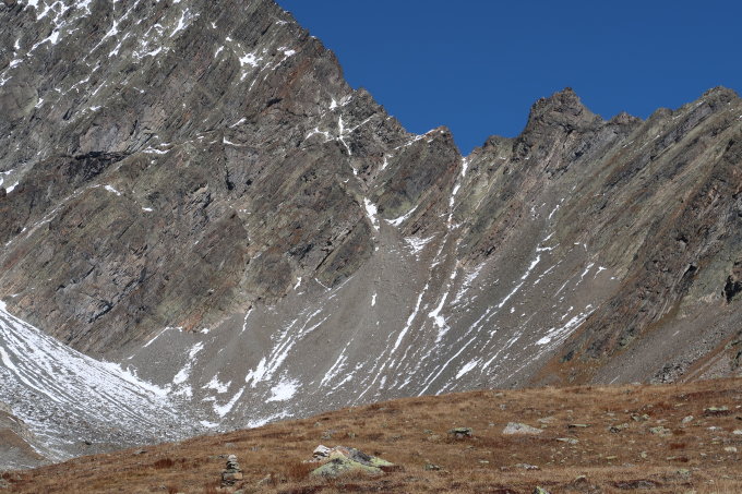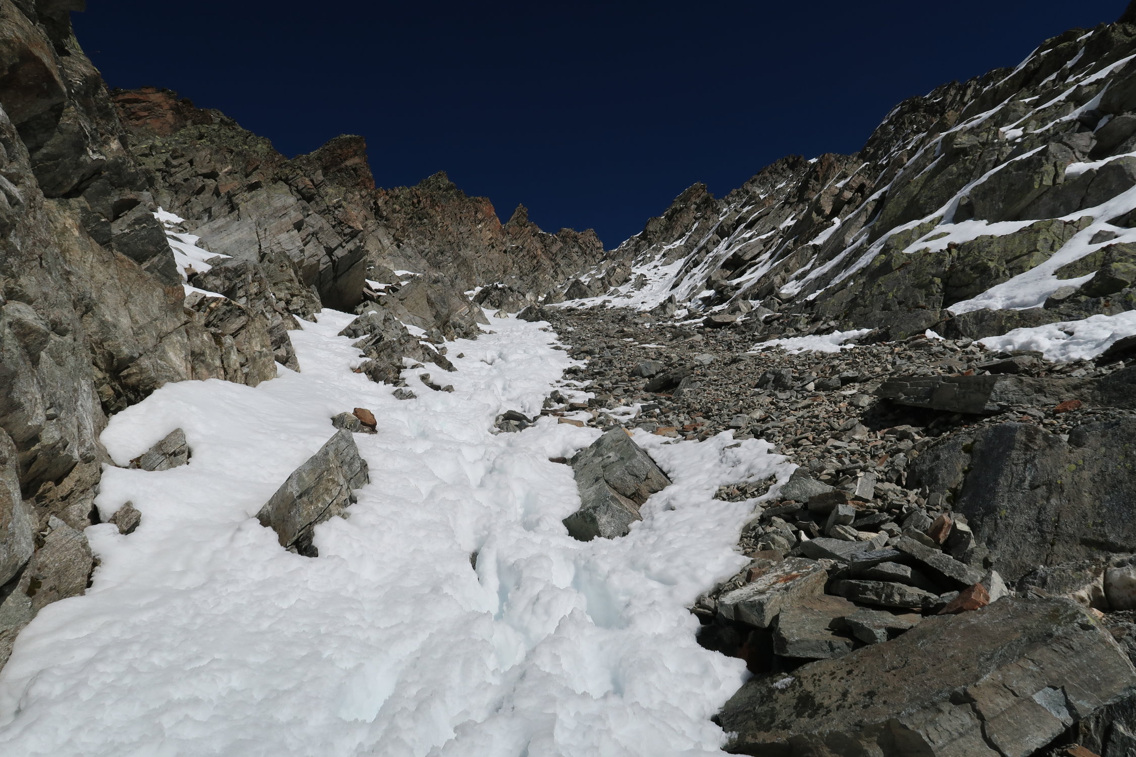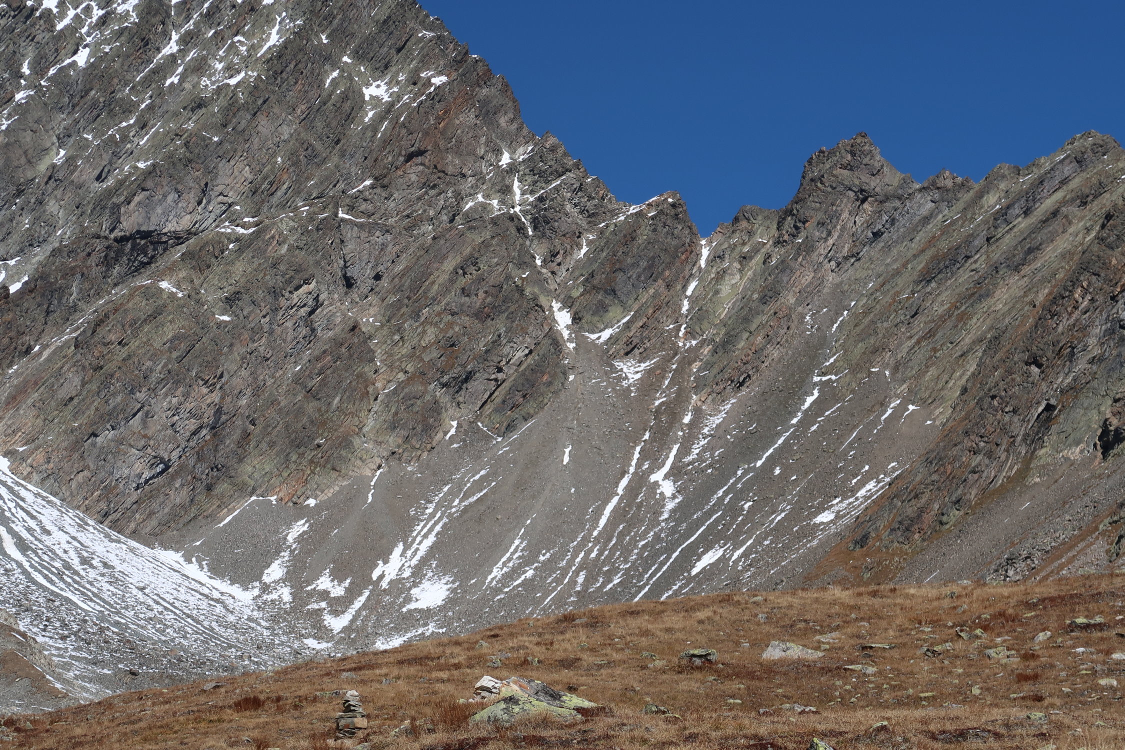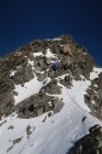Im Abstieg in der Südwand zum Glück einiges an Schnee. Zum Glück weil der Schnee den ganzen Schotter deckt und der Abstieg dadurch schneller und sicherer gemacht werden kann.