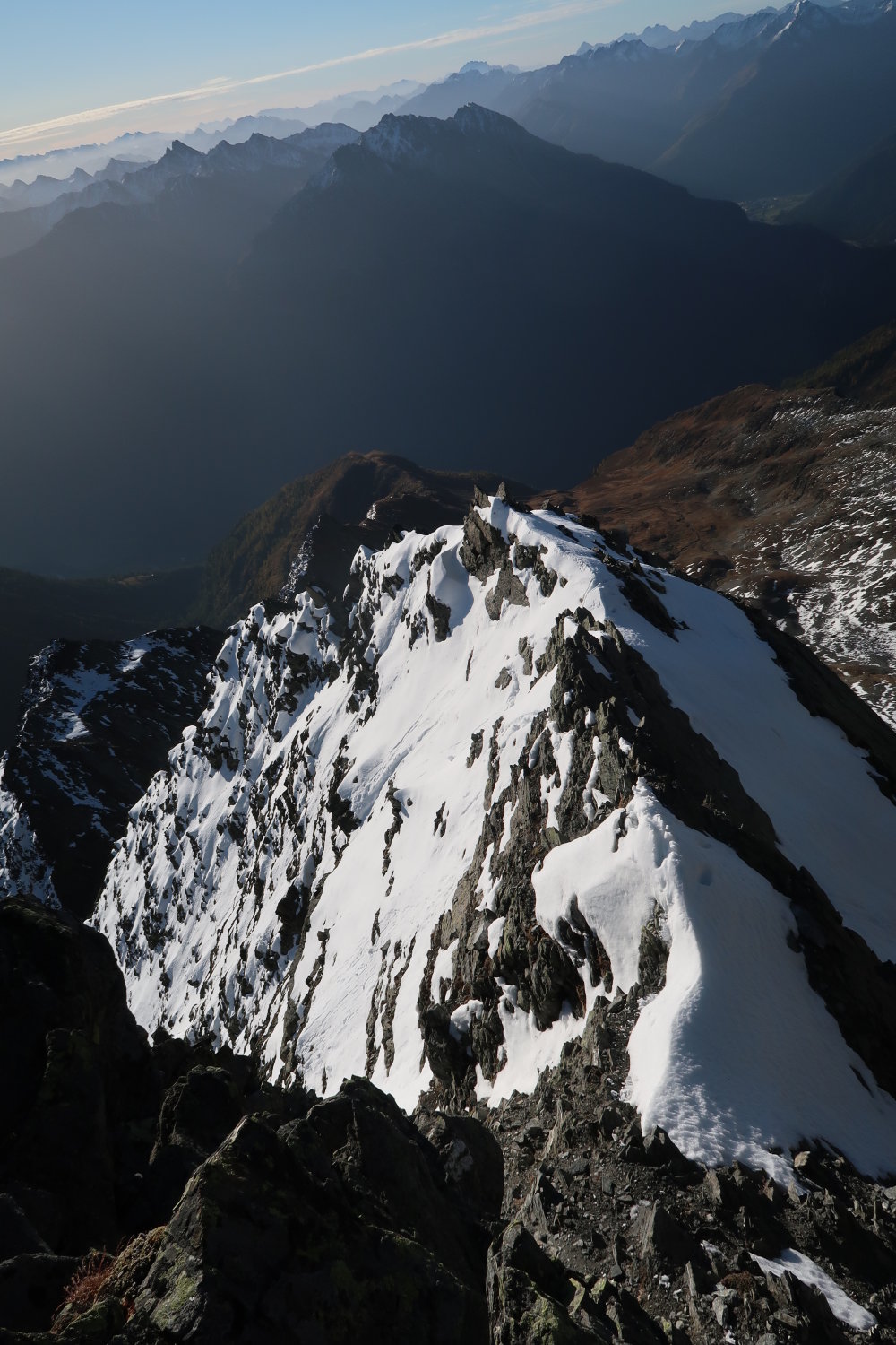 Auf der Nordseite des Grates einiges an Schnee, die Gratkante selbst ist weitgehend schneefrei und gut zu klettern. Der Schnee ist für die Begehung des Grates jedoch nicht störend. Da meist einbrechend war der Aufstieg ohne Steigeisen möglich.