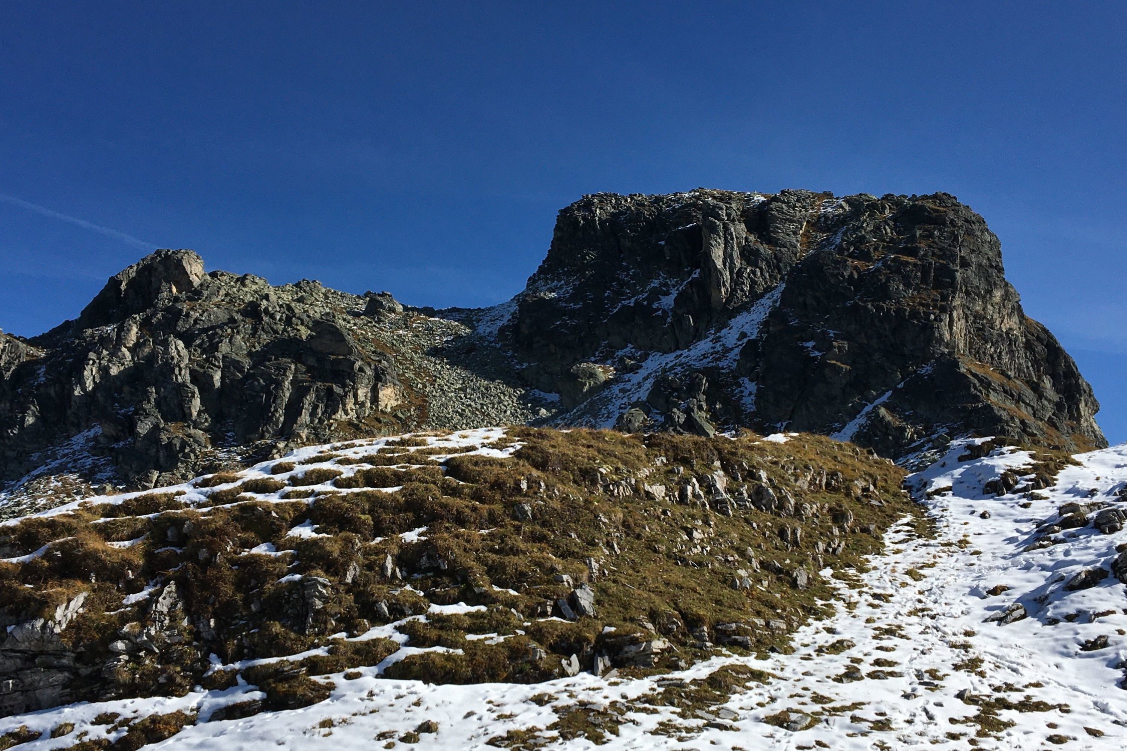 ohne Schnee oder mit viel Schnee wieder gut (wobei dann die südl. Umgehung des Gebirgsstocks problematisch sein kann) , bei diesen Verhältnissen eher anspruchsvoll (T5)