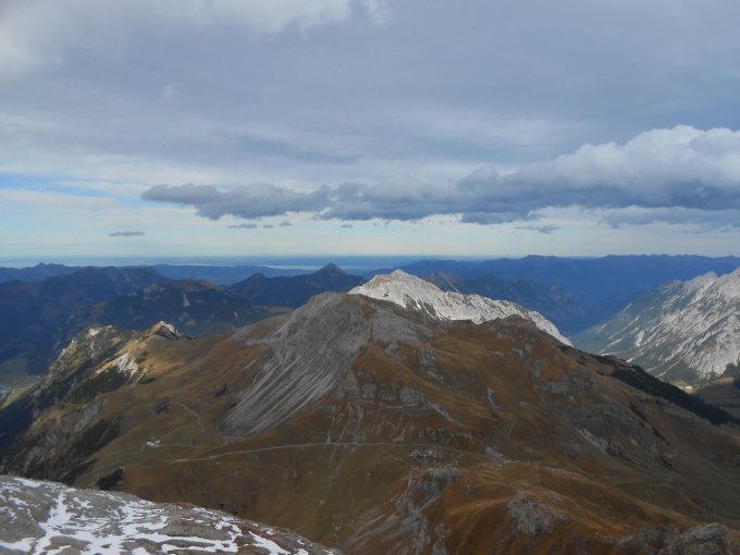 Es war Dank Föhn alles gut trocken. Lediglich im Zustieg zum Ijesfürggli und beim Abstieg vom Gipfel gab es etwas Schnee. Der Föhn stürmte kräftig von der Seite und erforderte beim Gehen auf dem Grat erhöhte Aufmerksamkeit. Es ging aber besser als erwartet. Die extreme Wetterlage zauberte eine ganz besondere Stimmung in die einsame Gebirgswelt. Am Gipfel waren wir allein, so wie wir ab Obersäss bis zur Pfälzer Hütte niemanden getroffen haben. Lediglich ein E-Biker verirrte sich noch zur bereits geschlossen Hütte.