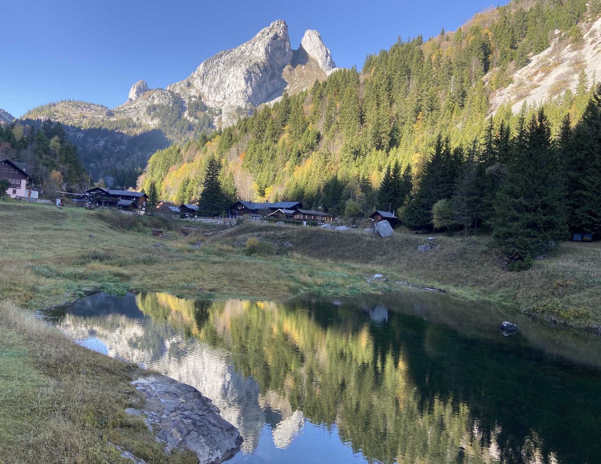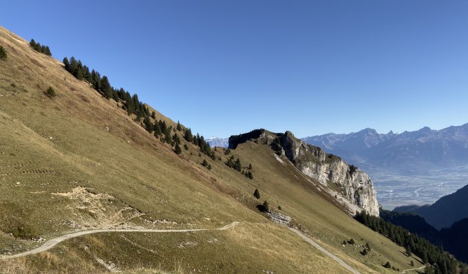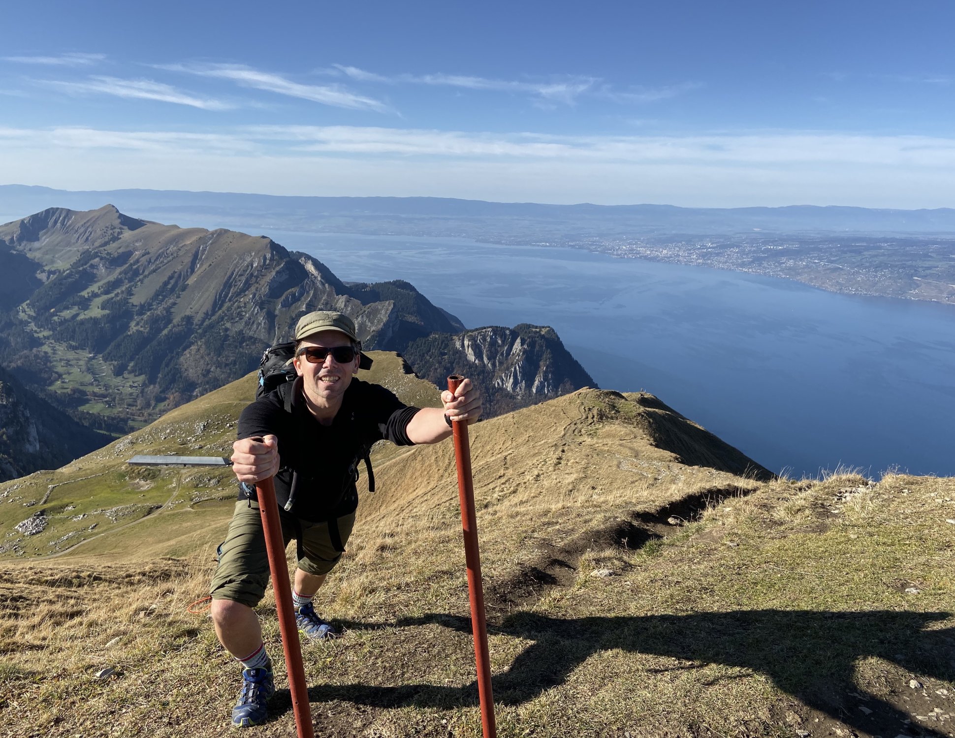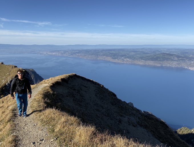 Grandioser Rundumblick auf den Genfersee, Jura, Berner Oberland, Walliser Alpen, Mont Blanc. Wir haben sehr gut gegessen in der Refuge du Grammont bevor wir weiter nach Le Flon hinunter gingen.