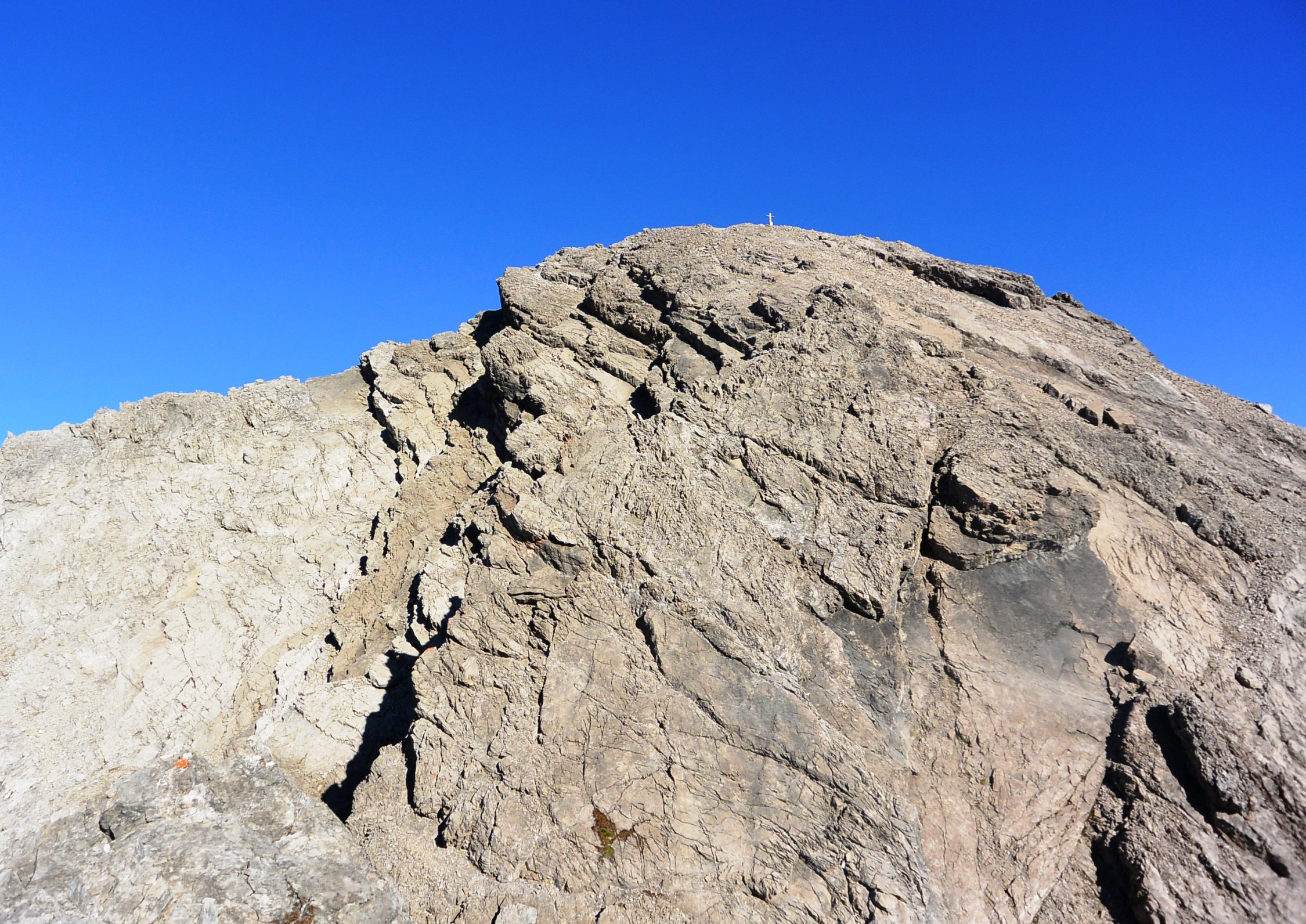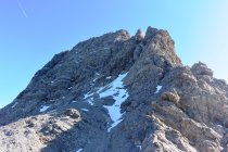 Gipfelanstieg alles trocken und beste Verhältnisse. Am Westgrat im unteren Teil Nordseitig teils harte gefrorene Schneefelder.