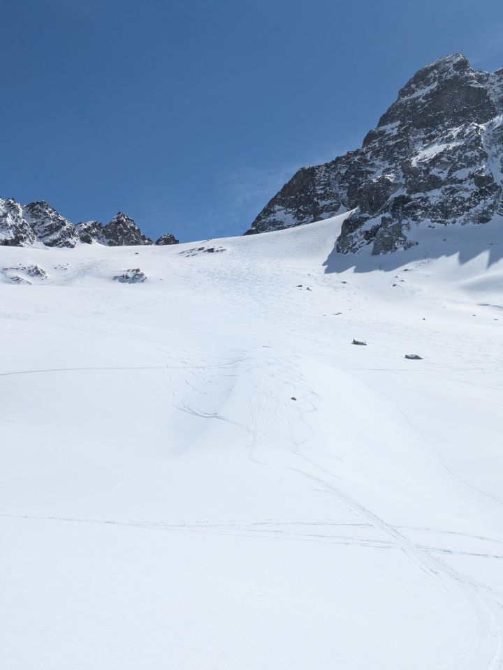 Ab der Hütte rechts herum via Plazzetta problemlos ohne Harscheisen über die Porta d Es-cha. An der Porta d Es-cha sind gut ausgetretene Spuren. Manche mit/ andere ohne Steigeisen. Anschließend Seil-frei über den Gletscher. Ab dem Ski Depot bis zum Gipfel problemlos. Der gesamte Weg ist gut ausgetreten. Es war sehr viel los (Ostersonntag). Es gibt ausreichend Bohrhaken (wenn man sichern möchte). Ein 40m Seil hat absolut ausgereicht. Anschließend Abfahrt bis nach Bergün/ Latsch. Bis zum Parkplatz mit ein paar Mal tragen gut möglich. Jedoch wird das schon in ein paar Tagen unten raus schwierig werden. Sehr warm.
