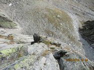 Achtung: die 5. und letzte SL im "Telefon Schatz", welche gleichzeitig auch Schlüsselseillänge ist, weist einen Ausbruch auf, der für uns nicht überwindbar war. Der einzig vorhandene Haltegriff war brüchig. Wir haben dann über die Route wieder abgeseilt, was sich, abgesehen von einem Verhänger an einer Wurzel auf einem grasigen Band, gut bewerkstelligen ließ. Gemäß Aussage von Hüttenwart Richard wird diese Route selten begangen. Angeblich waren wir die Ersten, die dort seit längerer Zeit wieder mal drin waren. Insofern war´s kein Wunder, dass die 4c-Seillänge nahezu komplett von Flechten überwuchert war.