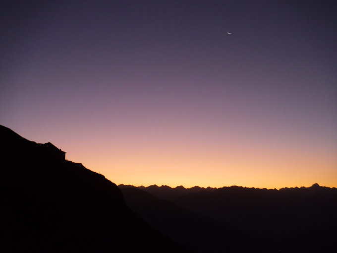 Tourenbeginn um 04:15 Uhr Sommerzeit bei 9°C unter sternenklarem Himmel am Nationalfeiertag in Österreich. Am Morgen blies kräftiger kalter Südföhn über den Gatschkopf, besorgte jedoch klare Fernsicht.