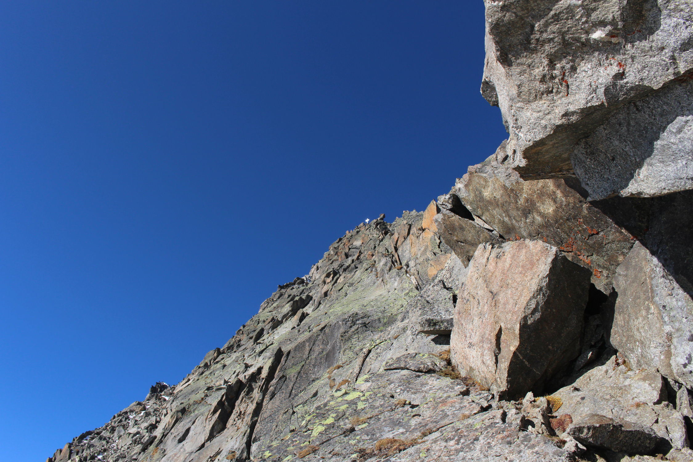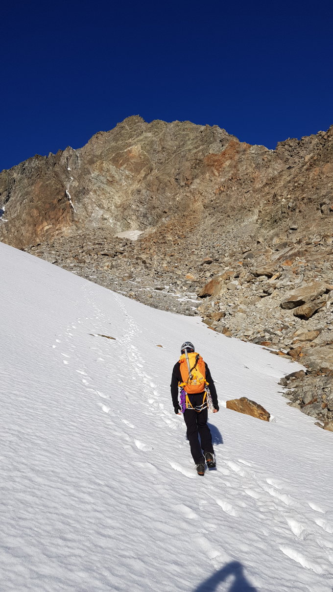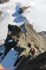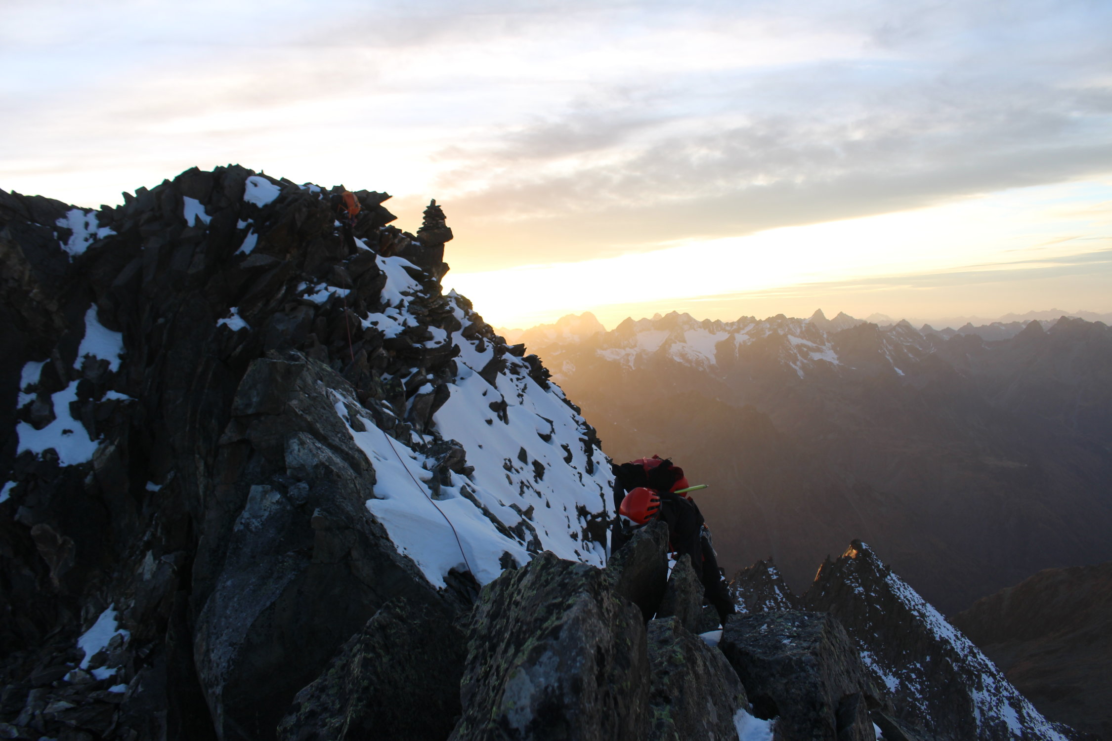 Der neue Abstieg über den SW-Grat, gut markiert und mit ein paar Bohrhaken gesichert, war dann aber wegen des schon älteren, noch nicht abgebundenen Schnees heikel. Die Bezeichnung "SW-Grat" klingt nach einer auch im Herbst sonnenbeschienenen Genusskletterei. Das täuscht. Der Grat hat viele Passagen, die schattseitig sind und in denen sich im Herbst lange der Schnee hält.