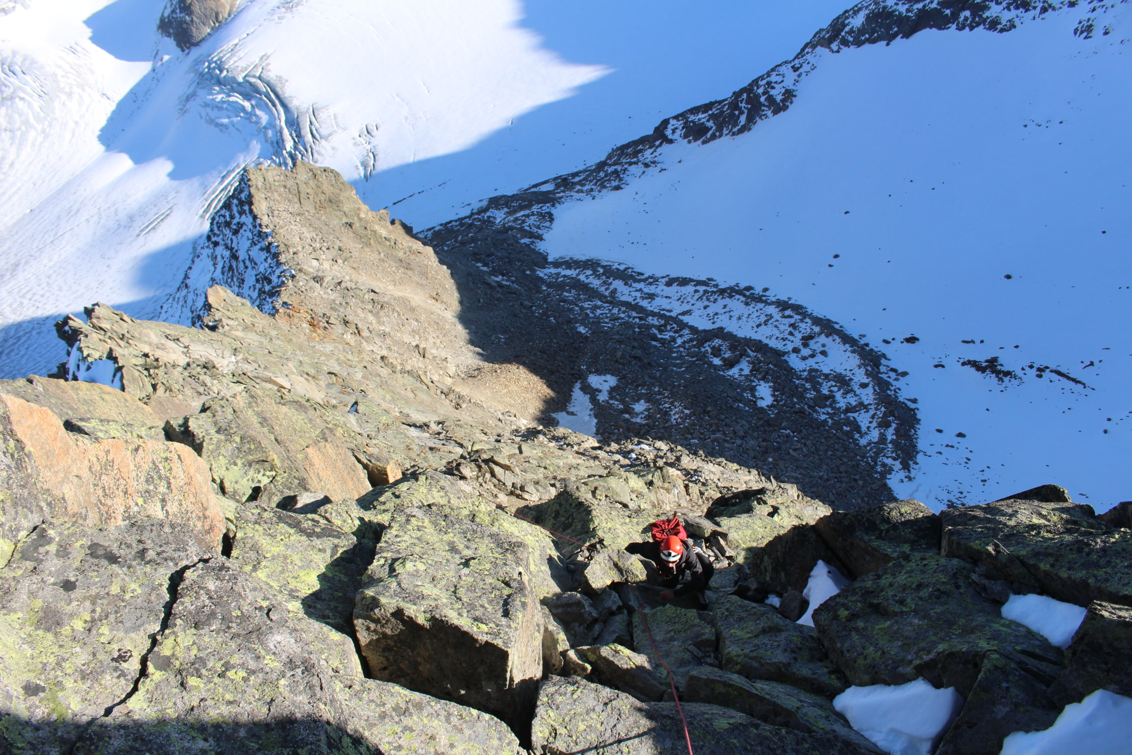 Der Ostgrat war weitgehend trocken mit einzelnen Schneeflecken auf der Schattenseite, sehr schön bei dem Traumwetter vorgestern. Die Südwand, über die der alte Abstieg ging, war komplett schneefrei und trocken. Genau auf diese Verhältnisse hatten wir nach dem guten Wetter letzte Woche und der Wärme gerechnet.