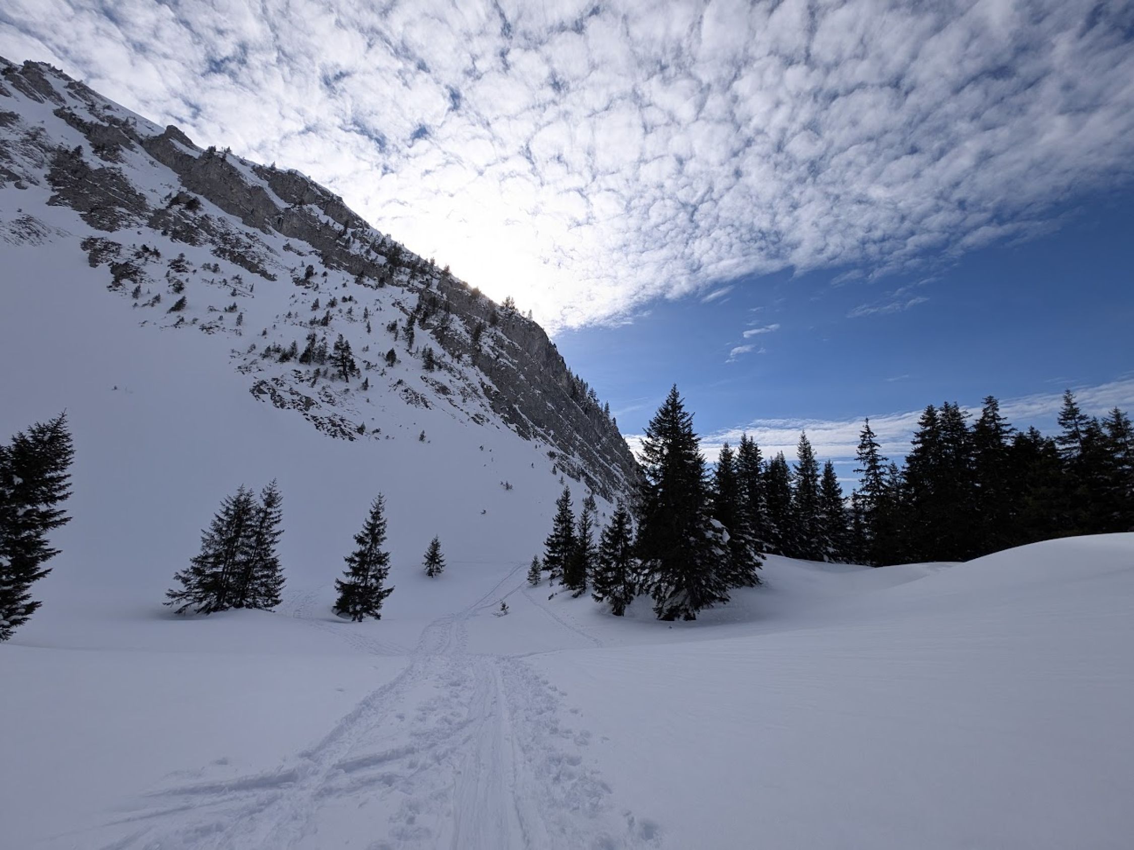 Endlich auch schon im unteren Bereich hoch zum Wiriehorn mal wieder ausreichend Schnee, was ich in den letzten Jahren dort nicht erlebt hatte und daher immer auf anderen Touren im Diemtigtal unterwegs war. Von der Staldenmaadhütte aus konnte man gut starten und hatte immer beste Schneeverhältnisse. Sicherlich eine der schönsten Skitouren im Diemtigtal, auch mit spannender Abfahrt im Wald und direkt darunter.