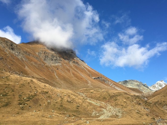 Start um 10.15 Uhr, Parkplatz Val d Agnel, 3 Grad, windstill. Zuerst die steile Ostflanke hoch, teilweise nass und rutschig, in einem Bogen bis zur markanten Stange und weiter zu P. 2541. Jetzt ohne Schwierigkeiten die Grashänge hoch bis P. 2746. Nun auf Grat, teilweise leicht ausgesetzt Richtung Gipfel, am Schluss steil hoch auf rutschigem Schiefer zum Gipfel mit der Wetterstation. Abstieg wie Aufstieg. Kein Schnee. T4.
