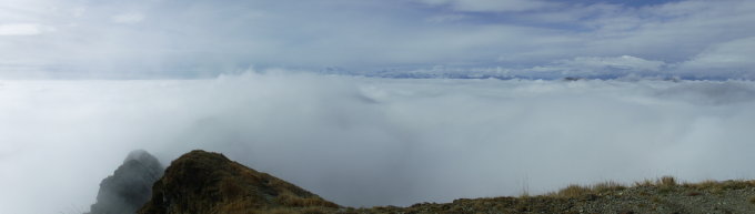 Tourenbeginn um 08:30 Uhr bei 12°C im Nebel. Der Hochnebel reichte bis zum Gipfel hinauf und dauerte den ganzen Tag an. Nur kurzzeitig war Sicht vom Gipfel über dem Nebelmeer möglich.