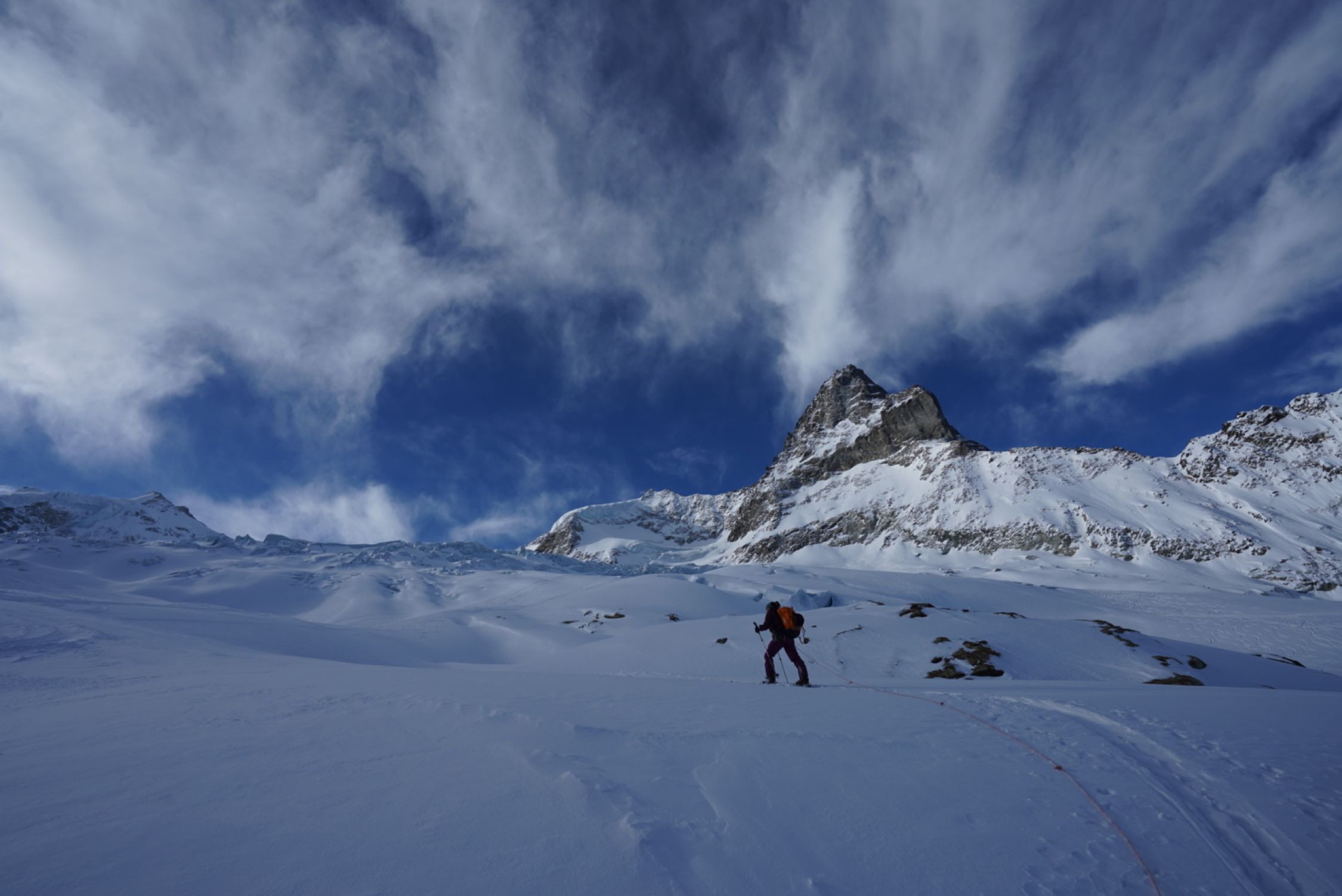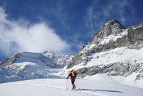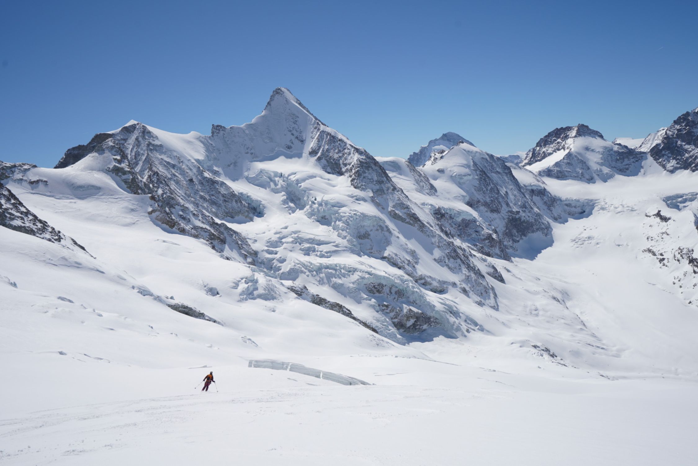 Dann Abfahrt dann über den Glacier du Mountet zum Glacier du Zinal. Sehr schöner Schnee (leichte Auflage auf harter Unterlage) mit sehr vielen schönen Schwüngen. Und ein grandioses Ambiente vor dem Obergabelhorn und Weisshorn. Wir sind deutlich südlich der Cabane du Mountet auf den Gletscher im Talgrund, das ging sehr gut. Ab 2700 m dann teils recht bremsender Schnee. Vom Gletschertor dann noch rausschieben/fahren nach Zinal.