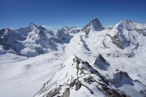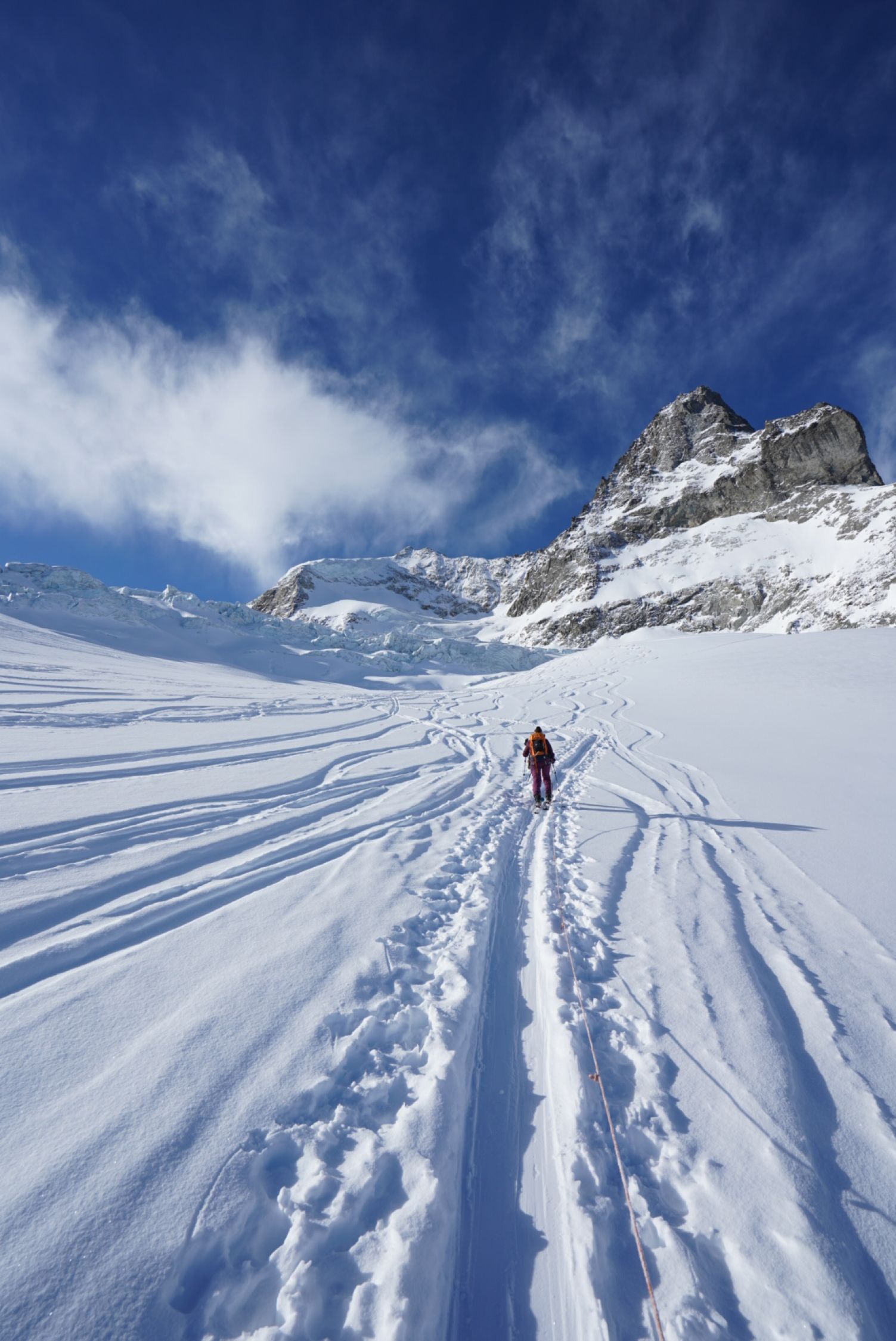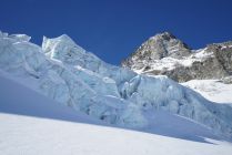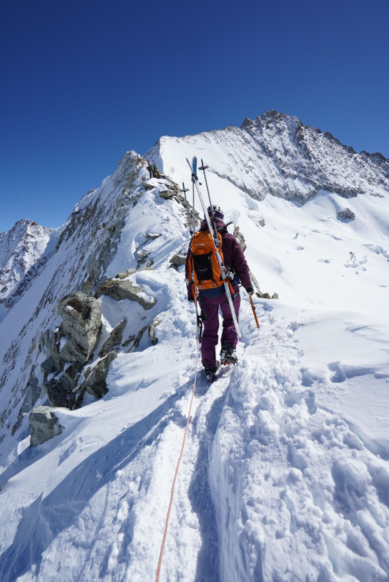 Aufstieg über den Gletscher zum Dôme sehr gut (Spur gar nicht hart) und landschaftlich überragend. Es hat eine gute Aufstiegsspur und viele Abfahrtspuren. Auch der letzte Teil zum Gipfel ist einfach. Wir sind dann über die Ârete du Blanc zu der flacheren Gratstelle etwas oberhalb P. 3724. Der Grat ist super gespurt, nur einmal 5 m abklettern, sonst einfach (und natürlich ausgesetzt).