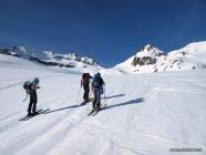 Aufstieg zur Guspislücke und auf den Rotstock. Schnee hart gefroren und gut tragend. Es hat recht viel Schnee auf dieser Strecke. Mit den Skis bis auf dem Gipfel.