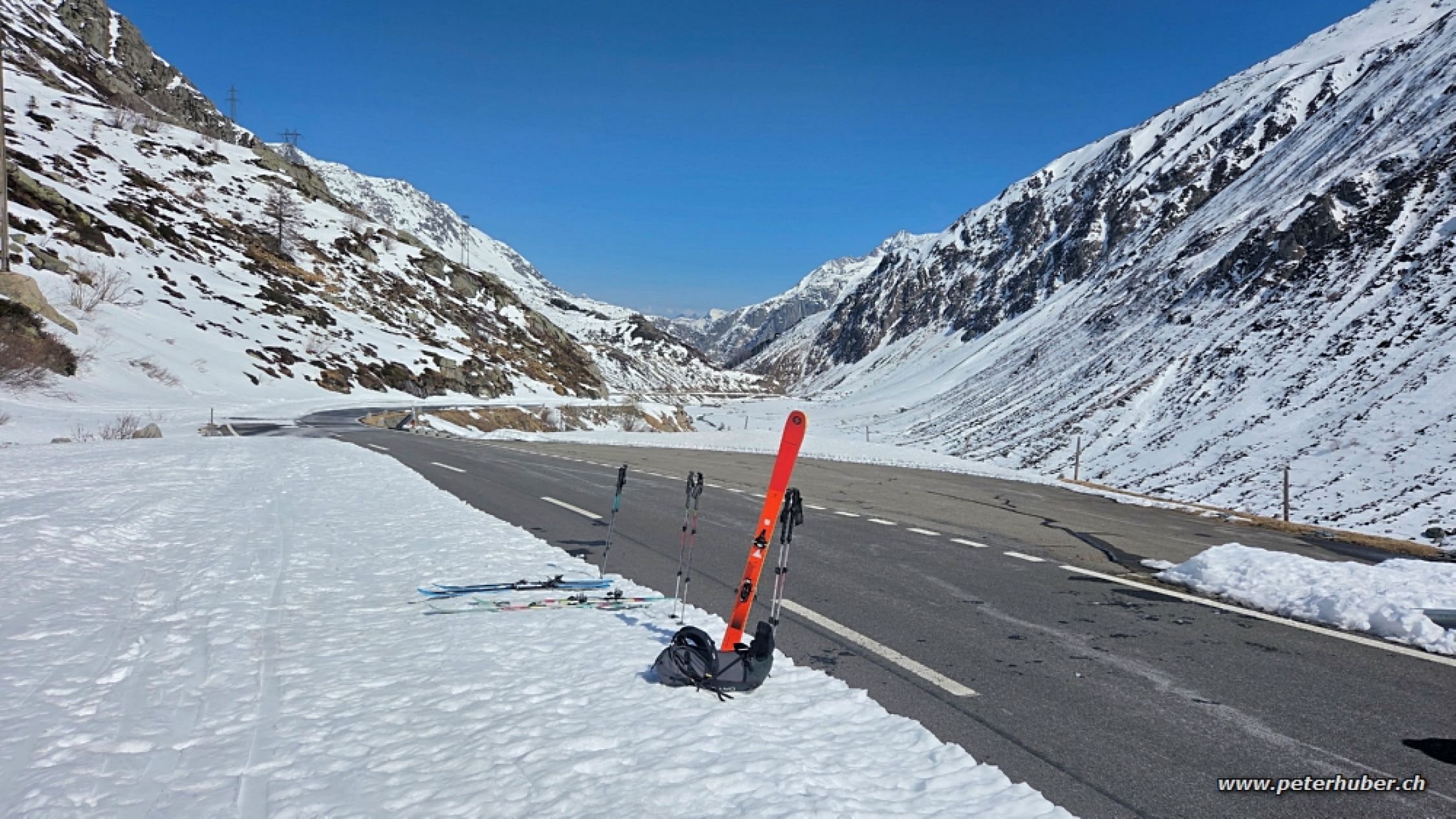 Abfahrt auf der Gotthardpassstrasse nicht so spassig, leichter Bremsschnee. Die Fahrbahn ist einspurig bereits geräumt. Für die Abfahrt reicht der Schnee auf der anderen Fahrbahn gerade noch so knapp, einige kurze apere Stellen.