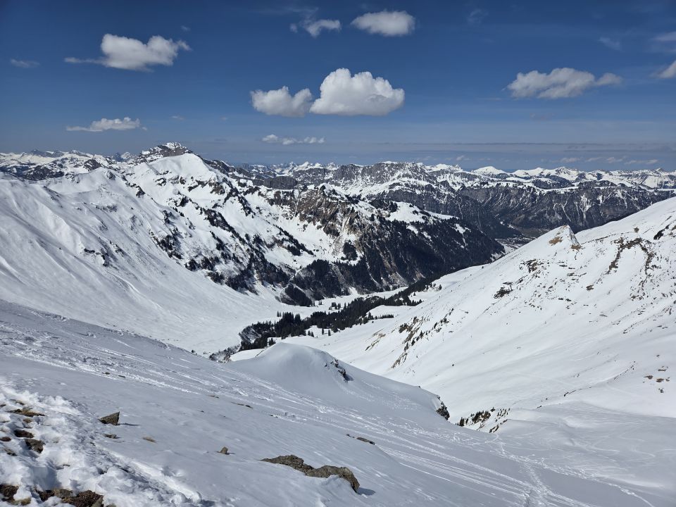 Start um 9.30. Ab Alpkäserei Schnee, der aber nicht mehr ewig hält. Aufstiegspur auf dem nicht steilen Teil des Zustiegs teils etwas mühsam. Ab dem Steilhang Chummli bis zum Gipfel 1A-Aufstiegspur.