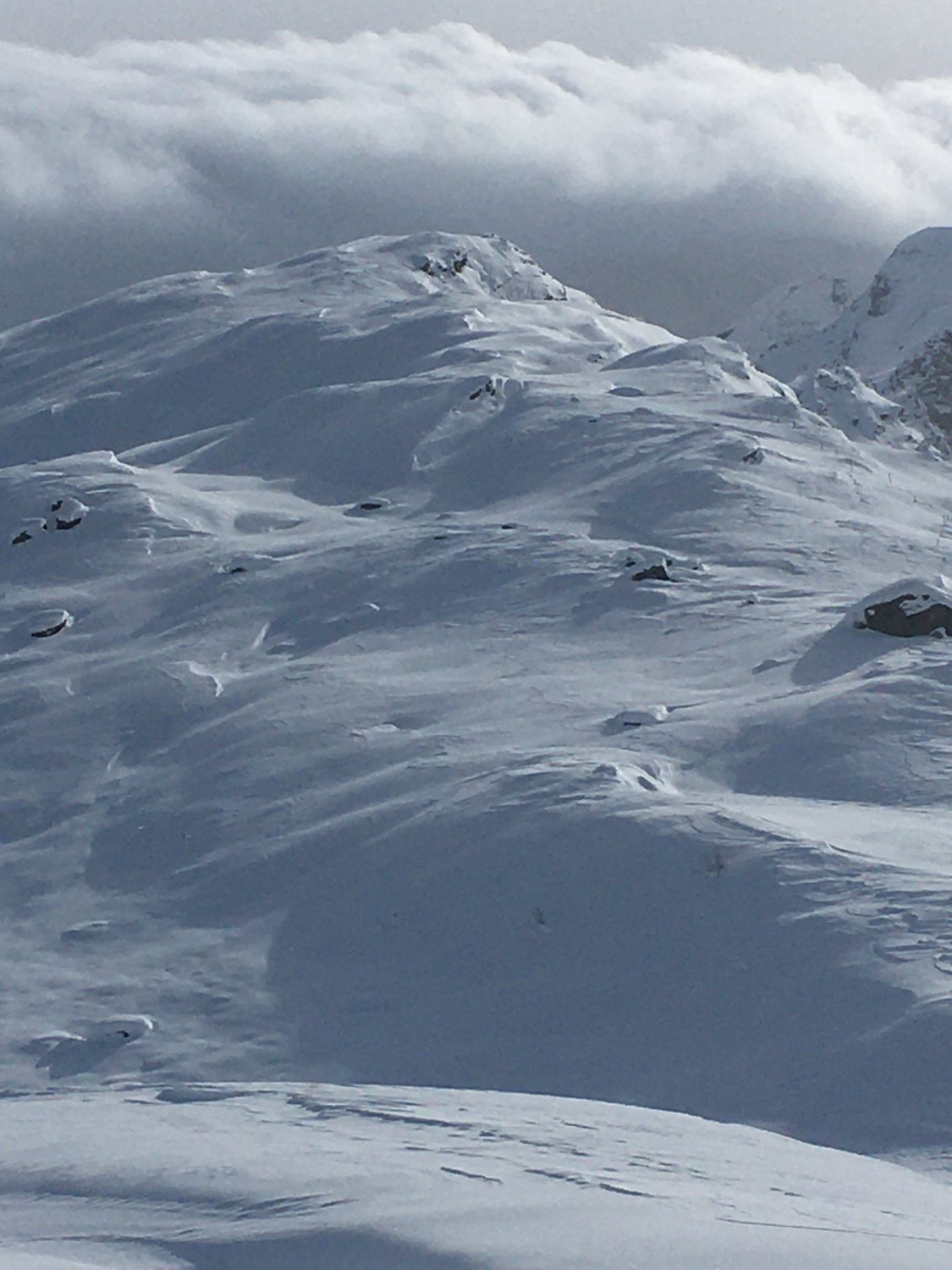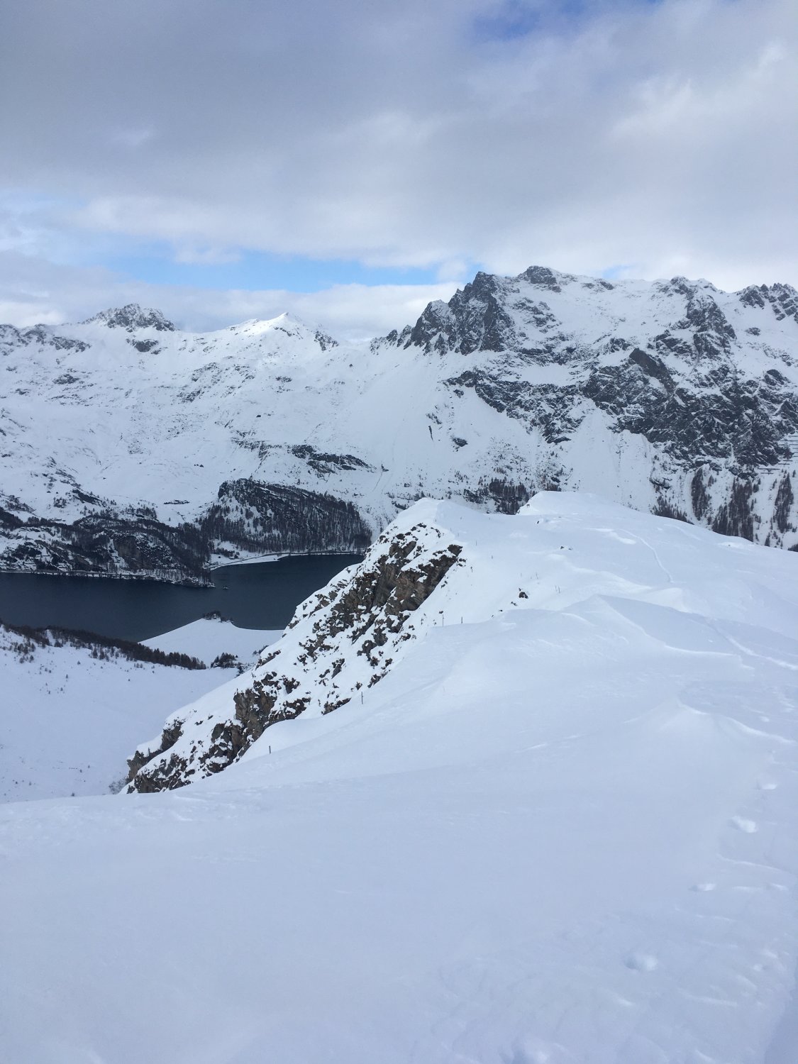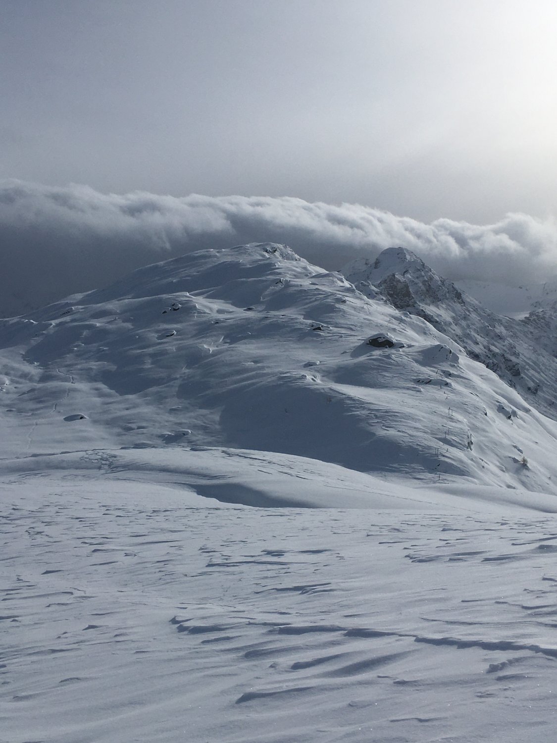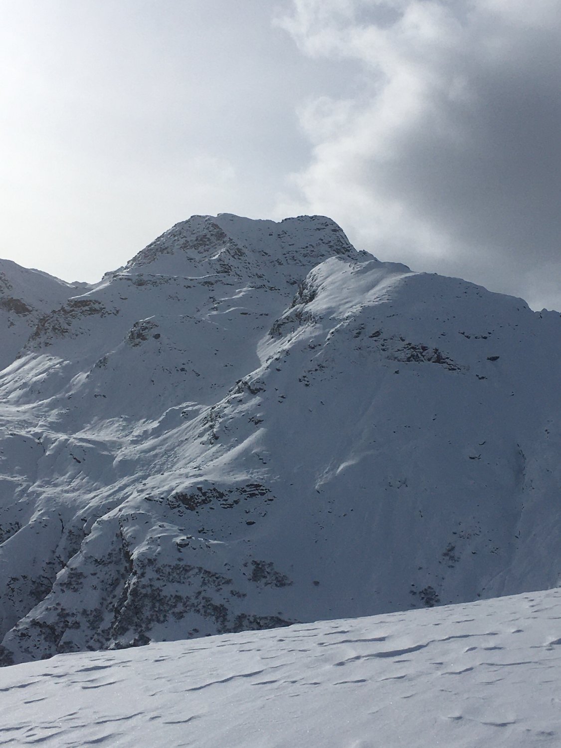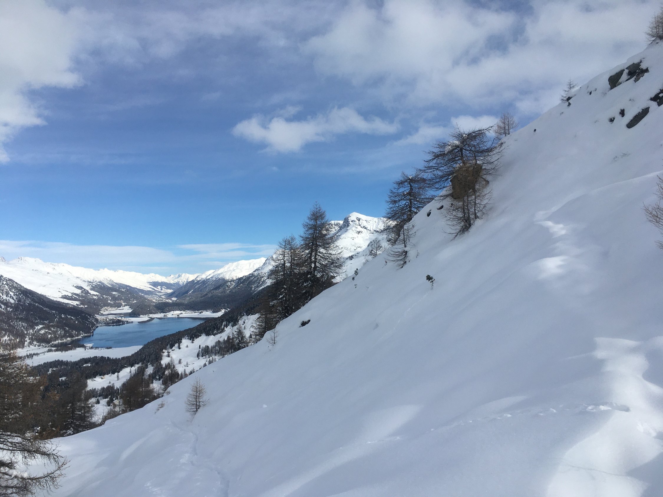 Start Parkhaus Sils (bis Ende November gratis) 9.15 Uhr. In Sils Maria minus 10 Grad und windstill. Bis 1910 Wanderweg geräumt, nachher spurlos bis P. 1937 und weiter auf geräumtem Wanderweg bis P. 1968. Nun neue Spur anlegen bis Gipfel. Ab P. 1968 etwa ein Meter Schnee und sehr anstrengende Spurarbeit. Bis Kuppe alles tief eingeschneit ohne Unterlage. Ab P. 2379 etwas weniger Schnee, ca. 70 cm Pulver. Ich benötigte fast 5 Stunden bis Gipfel. Auf Gipfel Sturm von Süden, teilweise bis ca. 100 kmh. Abfahrt entlang der Aufstiegsroute. Man muss steil fahren, sonst bleibt man im Tiefschnee stecken.