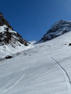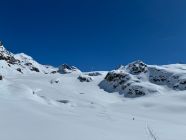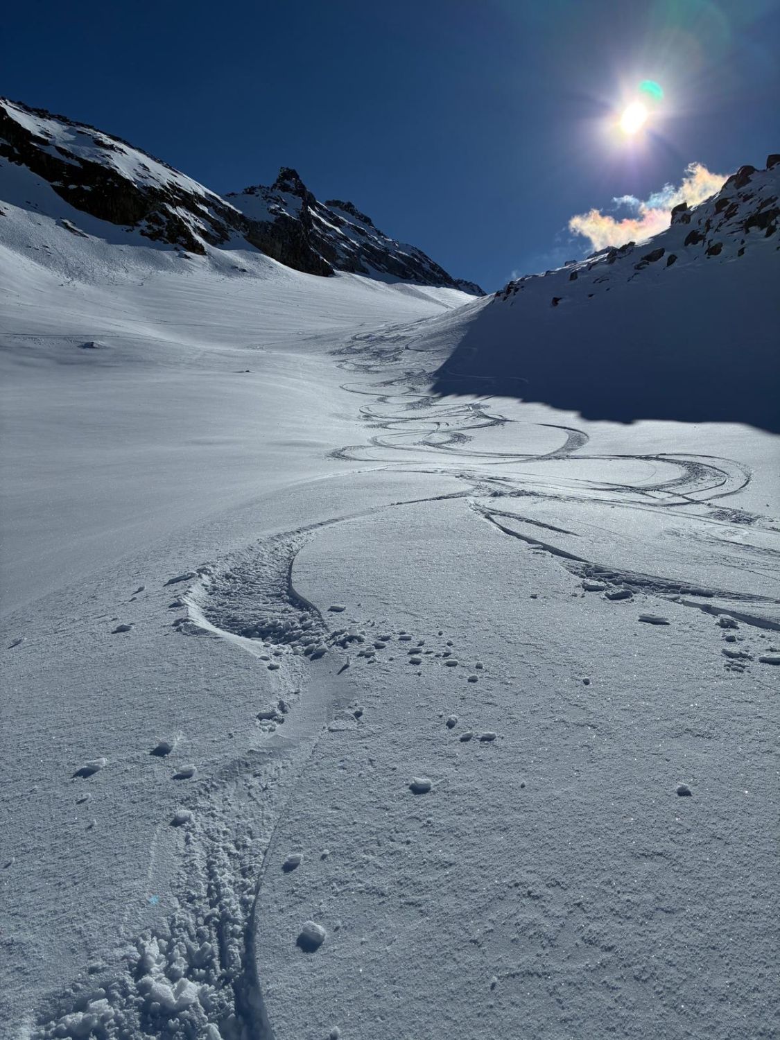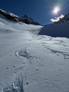 Chammgletscher teilweise hart, aber auch schöner Presspulver. Abfahrt um ca. 1000.