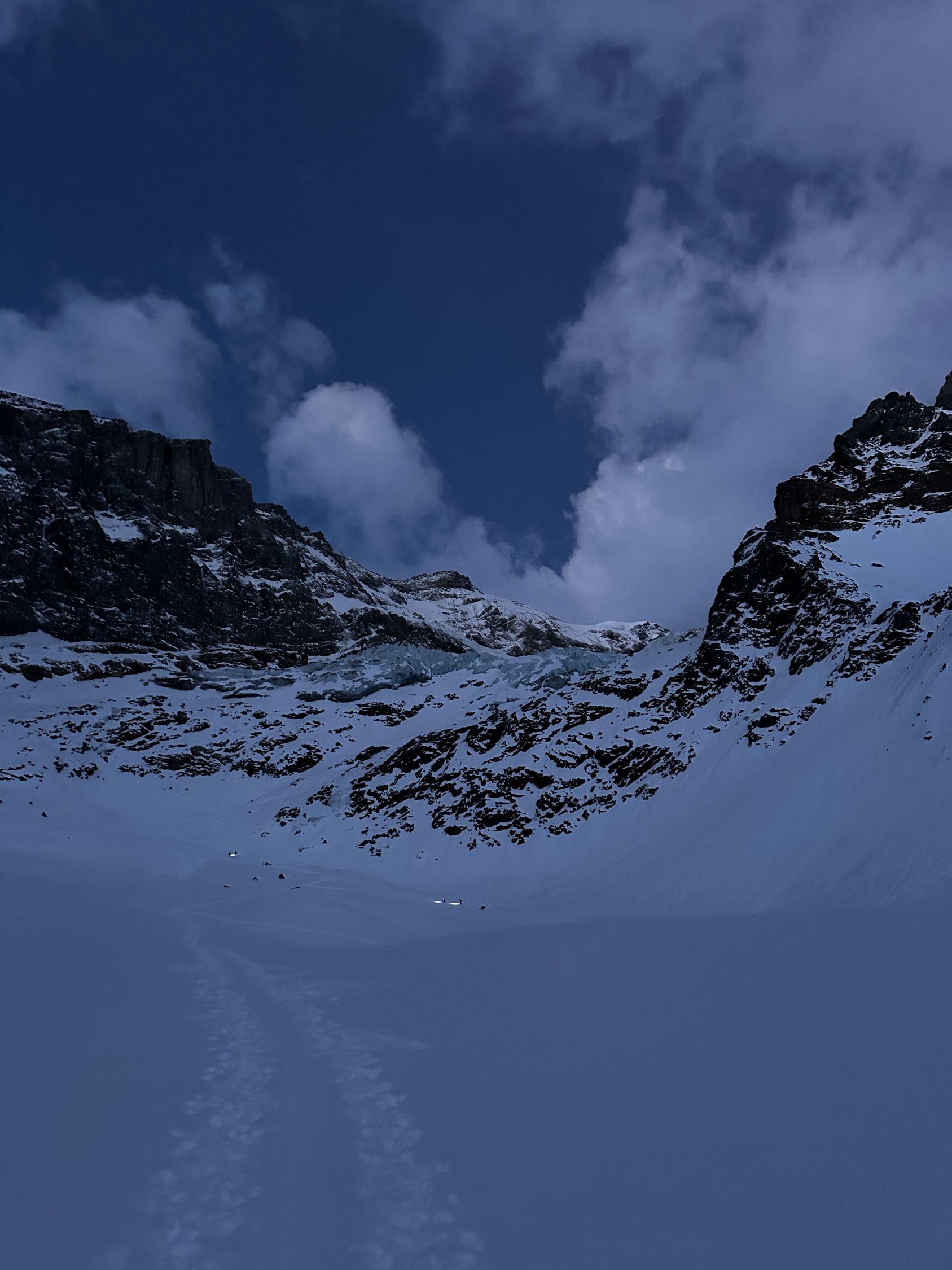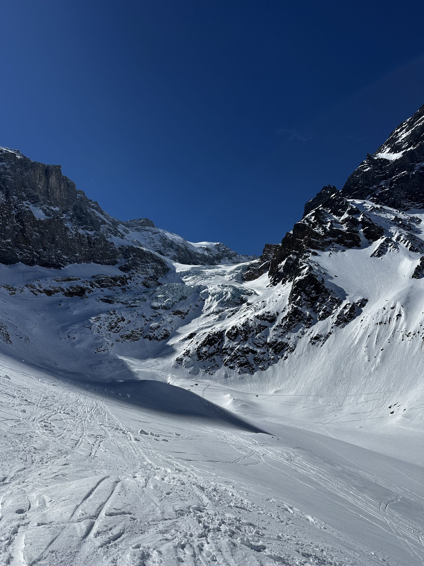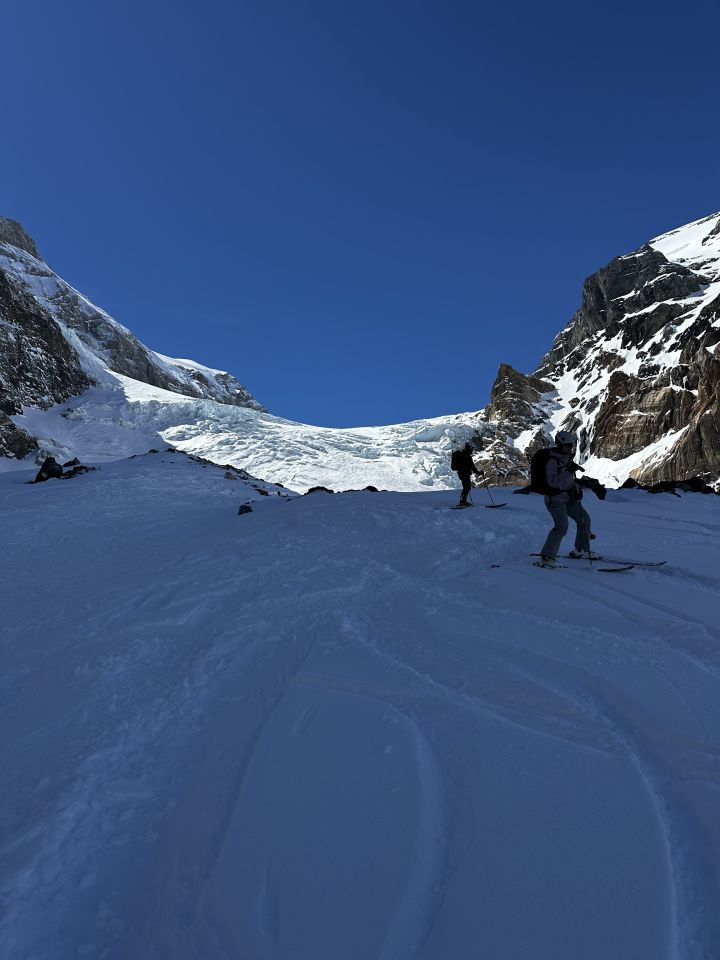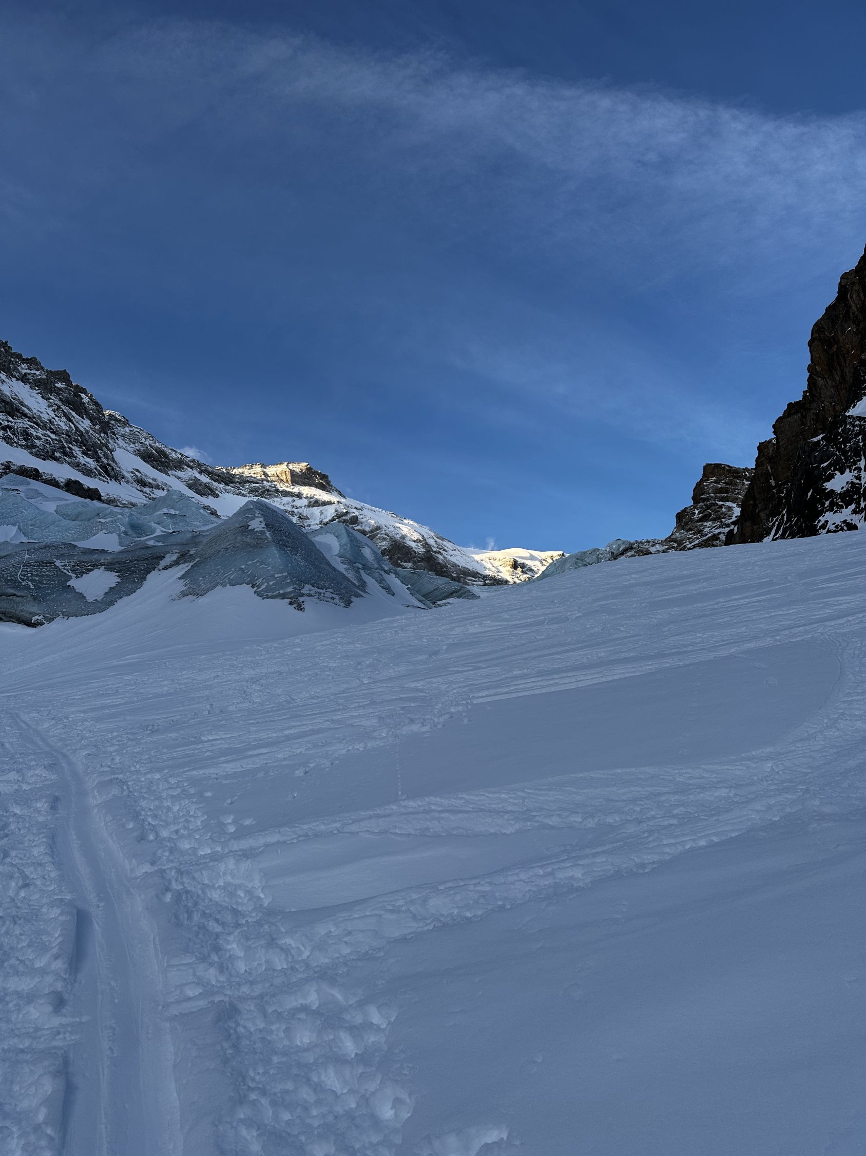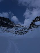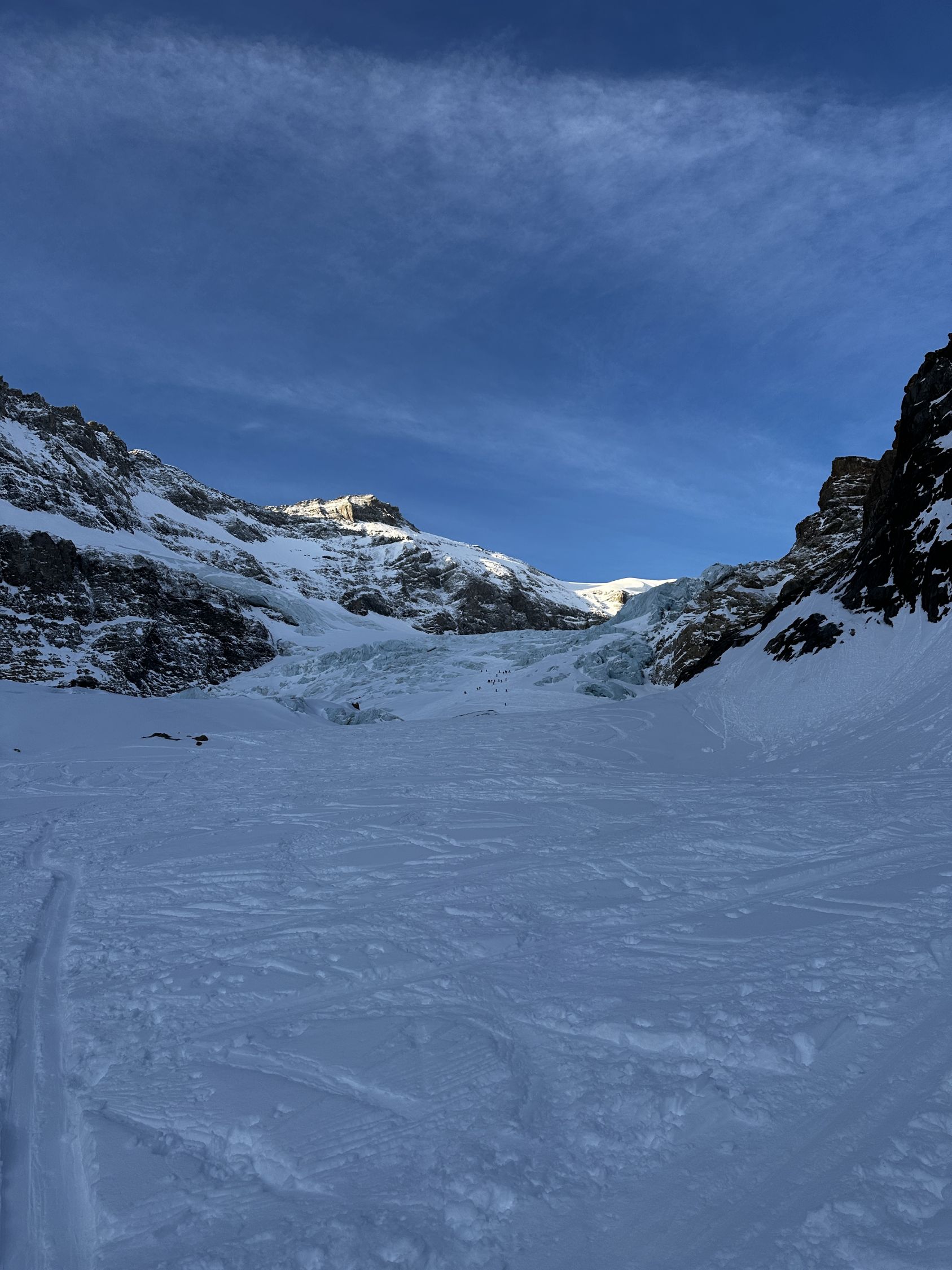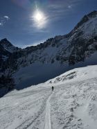 Ski ab Parkplatz Tierfehd montiert und ausser beim Tunnel nicht mehr abgezogen. Durch die warme Nacht sehr ringe Spur. Harscheisen nur beim 2. Gletscherabbruch montiert, geübte brauchen gar keine. Gletscher im Moment sehr gut eingeschneit.
