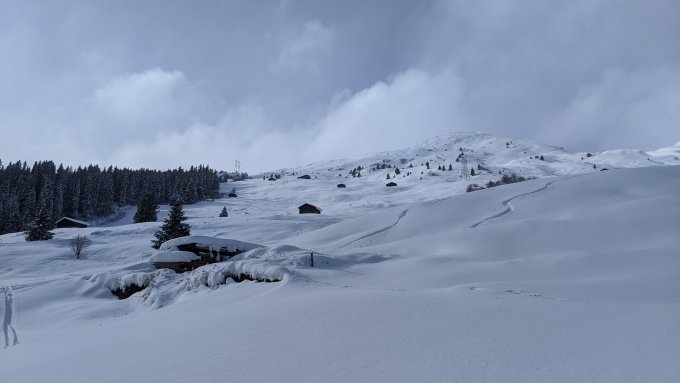 Im hinteren Safiental hat es ab ~1500m genügend Schnee zum tüürlen. Ab Parkplatz bis zu den Hütten auf 1900m ist der Schnee ohne Windeinfluss gefallen. Höher dann markanter Windeinfluss: wenig Schnee sich abwechselnd mit mächtigen Triebschneetaschen. Ich habe mir den Weiterweg gespart und dafür die Schwünge im Pulverschnee genossen. Das ganze viermal, auch so kommt man auf die Höhenmeter.