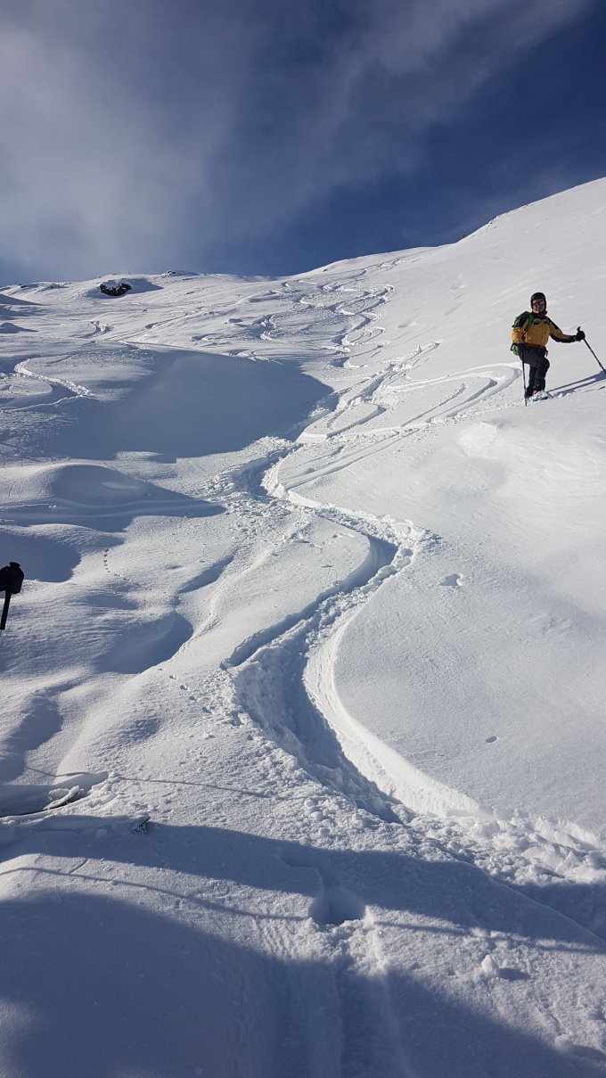 Die Schneemengen in St. Antönien halten sich noch in Grenzen, nordseitige Touren in nicht zu steinigem Gelände sind aber gut machbar. Heute empfahl sich uns der Eggberg. Start beim Parkplatz vor Litzirüti (Pt. 1460), es liegt genügend Schnee beim Parkplatz. Die Schneemächtigkeit ist noch so gering, dass das Terrain deutlich "durchdrückt". Dennoch fanden wir bei der Abfahrt hinreichend sanfte Hänge und Mulden mit herrlichem Pulverschnee, welche perfektes Fahrvergnügen bereiteten. Stellenweise dann wieder kurze Strecken, die etwas ruppiger, aber immer noch gut und ohne Steinkontakt zu fahren waren.