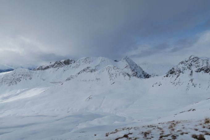 Auf dem Gipfel ist der Schnee etwas abgeblasen. Ansonsten tipptoppe Verhältnisse, bis ins Tal.