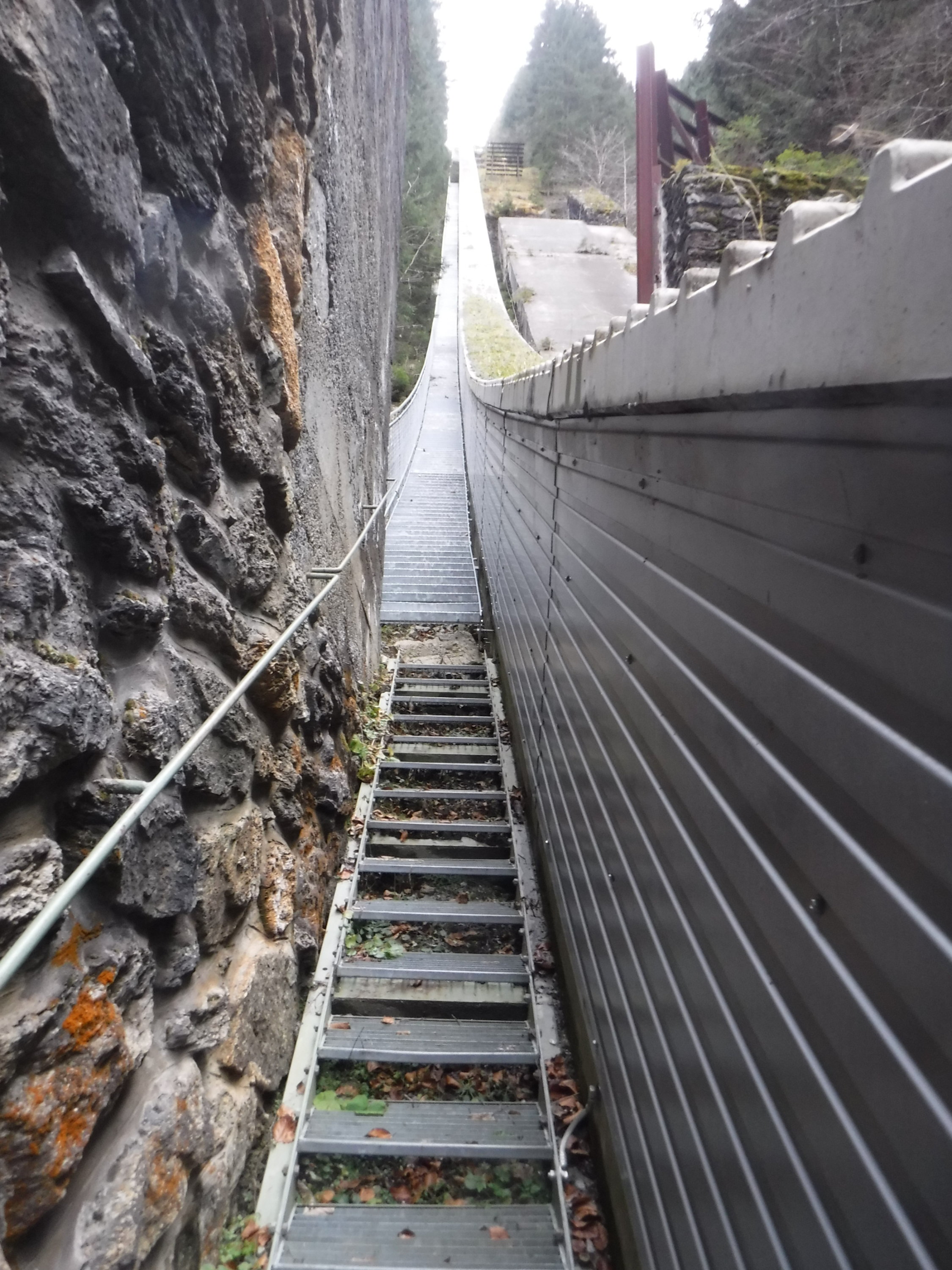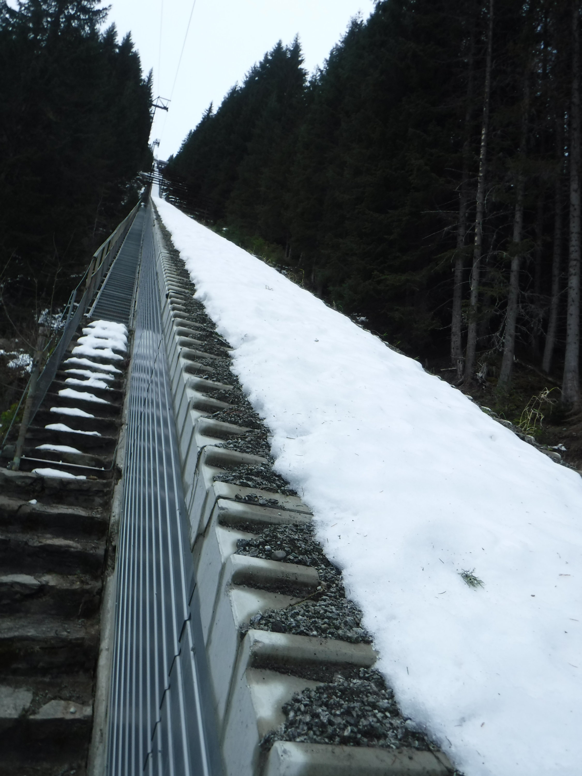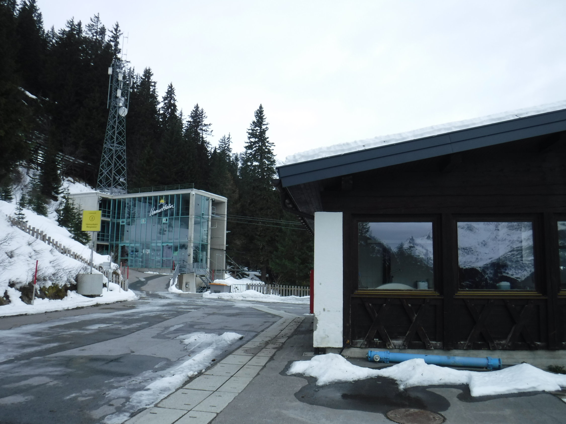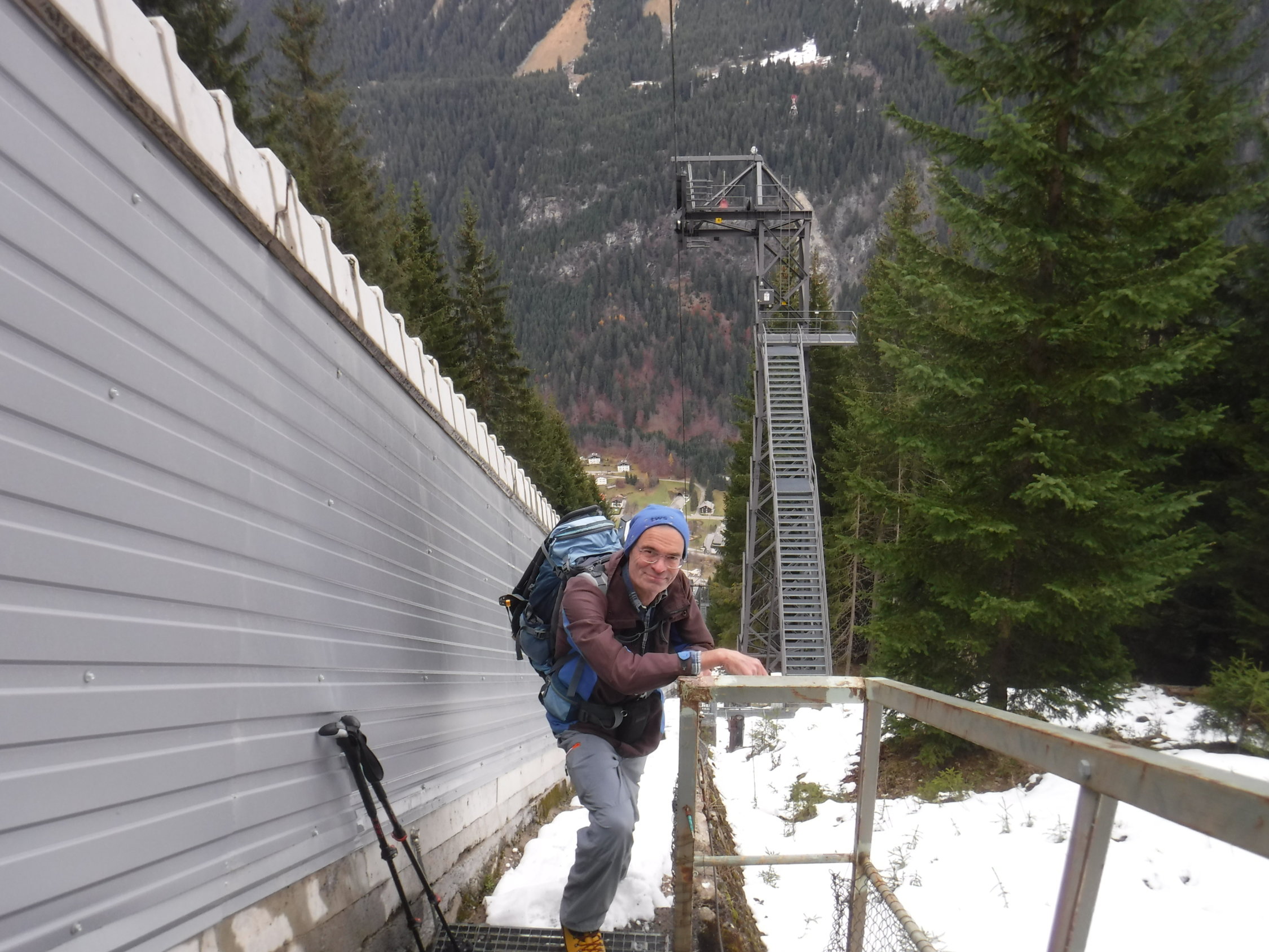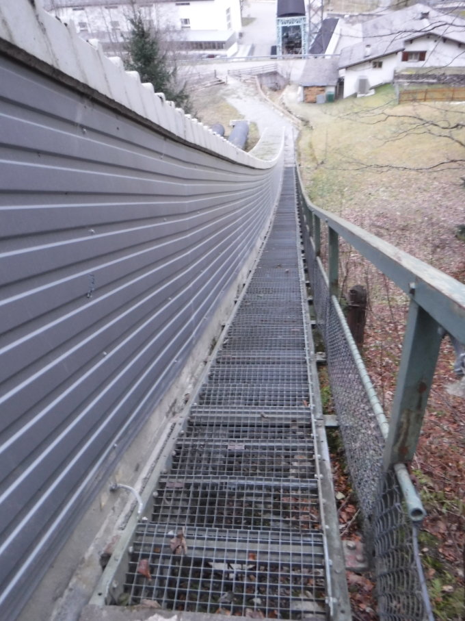 Der Zustand der Treppe ist an einigen Stellen (Steinstufen) etwas ramponiert. Läßt sich allerdings noch gut laufen, bis auf das „Kletterstück“ nach 400 hm. An der Treppe befindet sich ein Schild „Bis auf weiteres wegen Bauarbeiten gesperrt“. Das Schild ist auch schon in die Jahre gekommen. Im Montafon fuhren noch keine Seilbahnen. Darum war es auch auf den Straßen ungewohnt leer. Die Vermuntbahn nimmt erst ab 21.12.2019 ihren Winterbetrieb auf (bis 3.5.2020) täglich von 08:30 bis 16:00 Uhr.