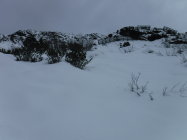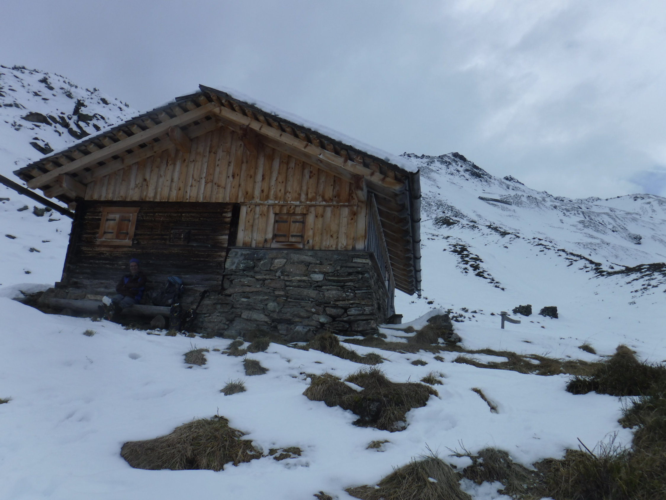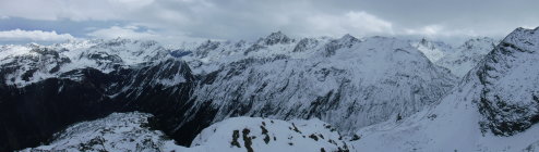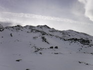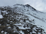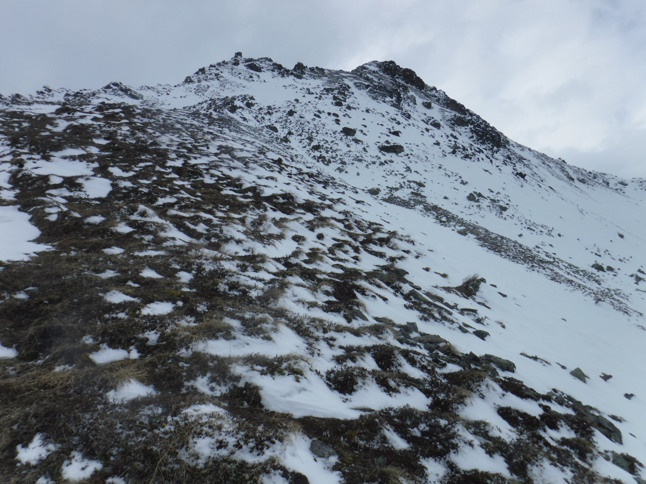 Tourenbeginn um 07:40 Uhr bei 5°C unter bedecktem Himmel. Im Gipfelbereich blies nur noch ein Rest des Südföhns. Oben war stellenweise viel Schnee weggeblasen. Die Hänge waren etwas tückisch zu laufen, da man teilweise mal bis zu den Knien einsank und mal nicht. Bei den abgeblasenen Bereichen gab es stellenweise Bruchharsch, wo an Tagen zuvor die Sonne hingekommen ist.