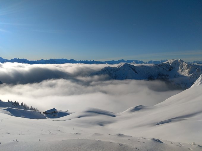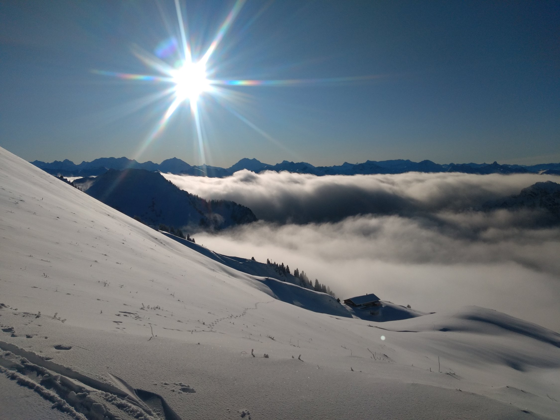 In Riggisberg um 07.00 noch Regen. Schnee ab ca. 1200 müM. Auf dem Gurnigel hat es dann teilweise aufgerissen.