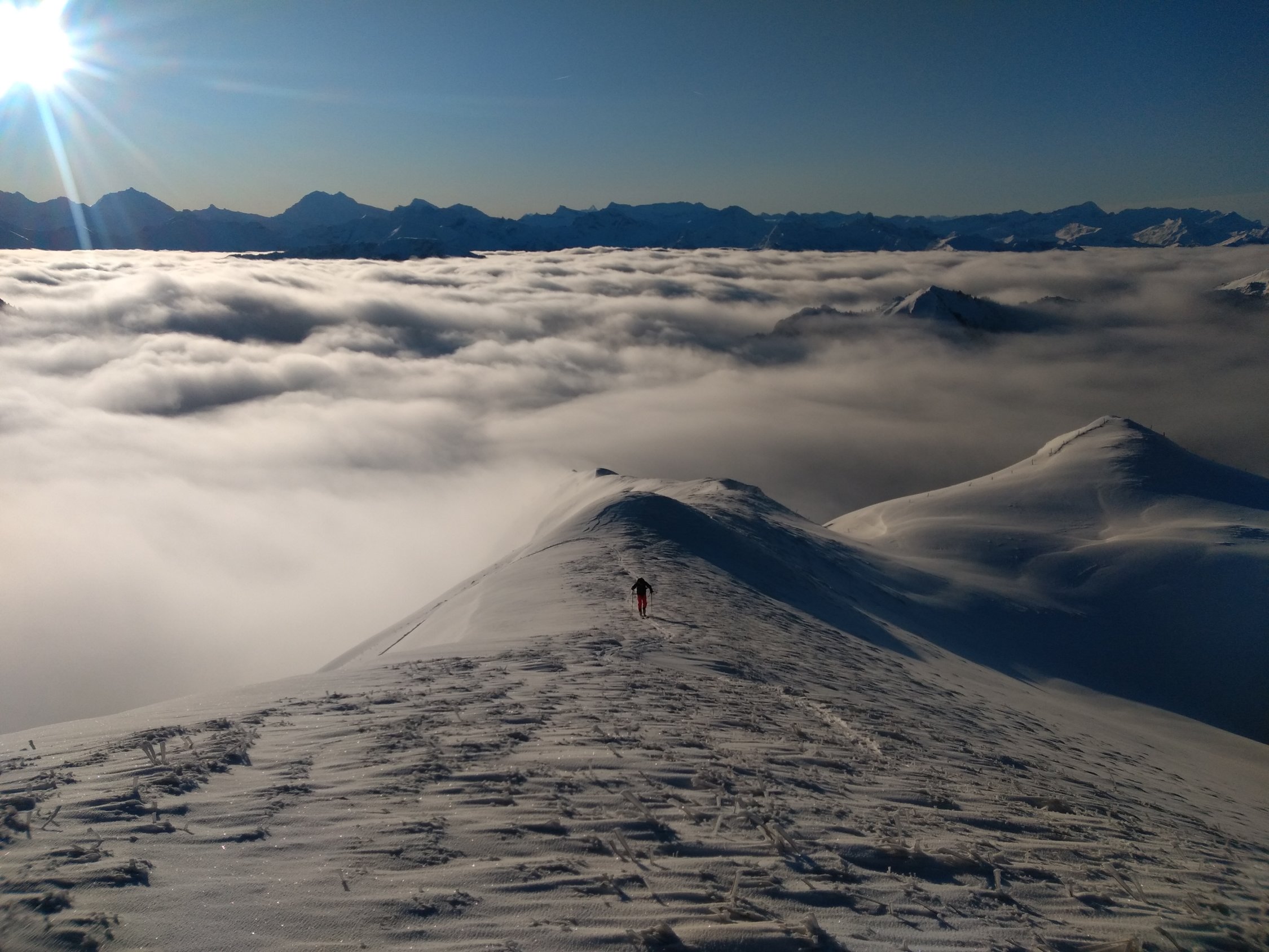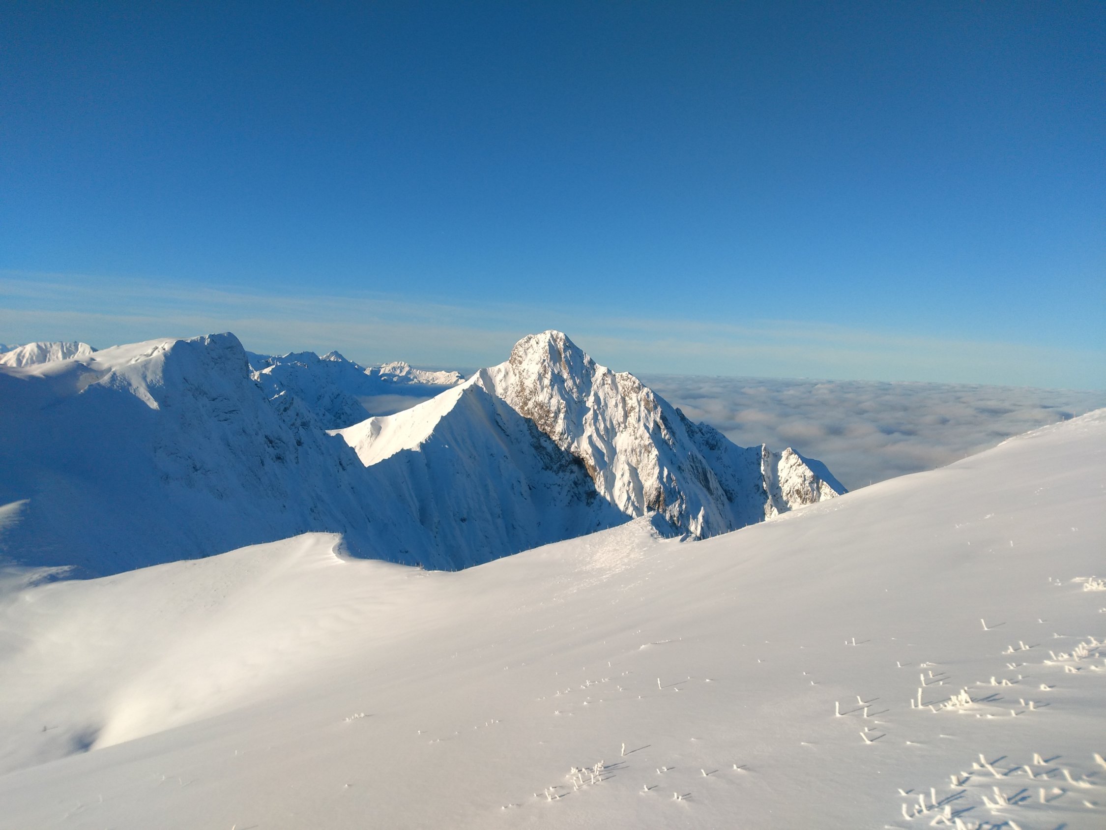 Normaler Aufstieg, haben alles gespurt. Hat immer mehr aufgerissen, traumhafte Verhältnisse. Auf Höhe Morgetenpass ca. 40 cm Schnee. Oben etwas abgeblasen, sonst hatte es scheinbar nicht viel Wind.
