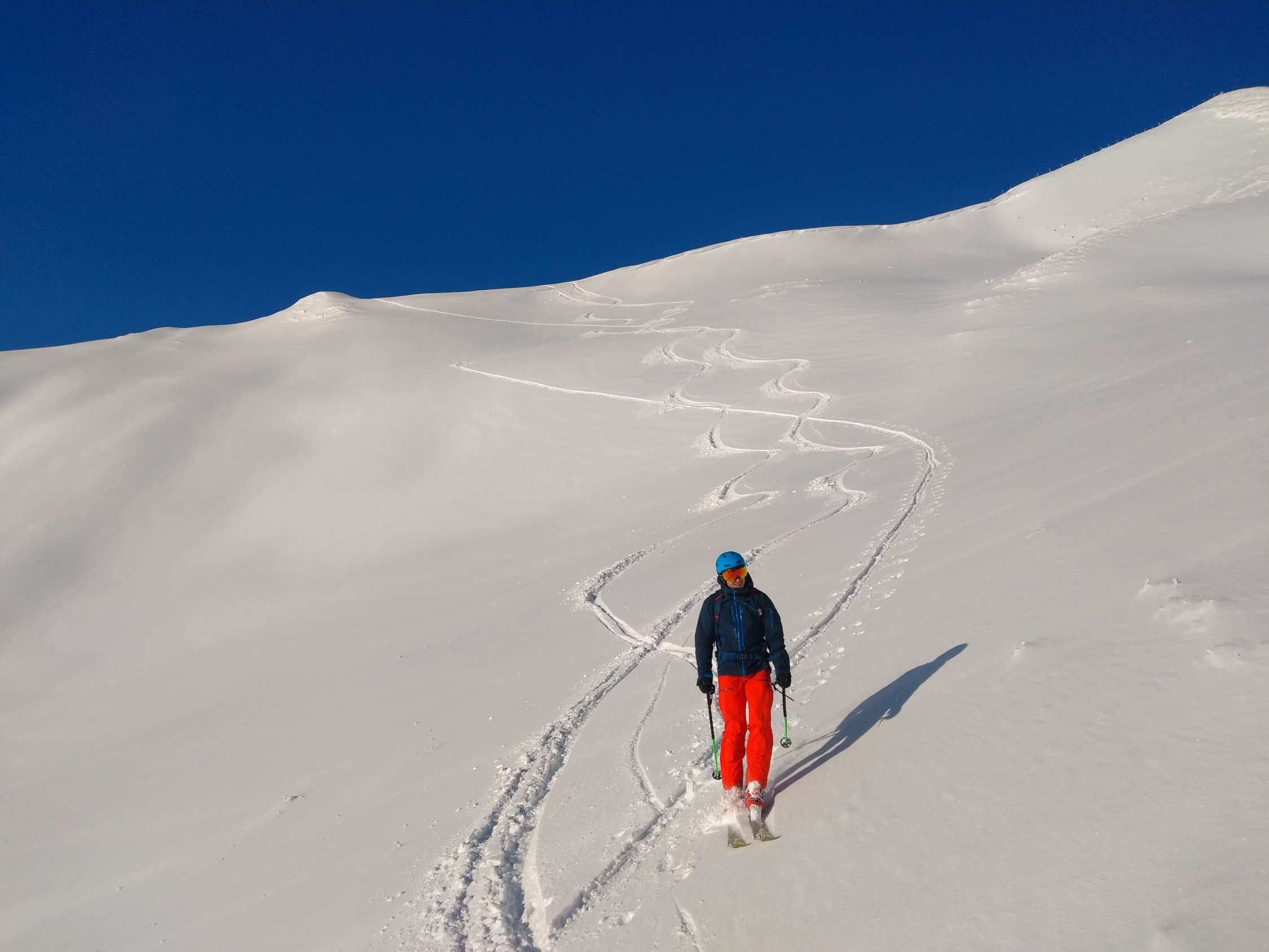 Abfahrt wie Aufstieg. Nur zwei Steinkontakte im letzten drittel. Schnee war super zu fahren! Waren nur sehr wenige Leute unterwegs, und eher später als wir.