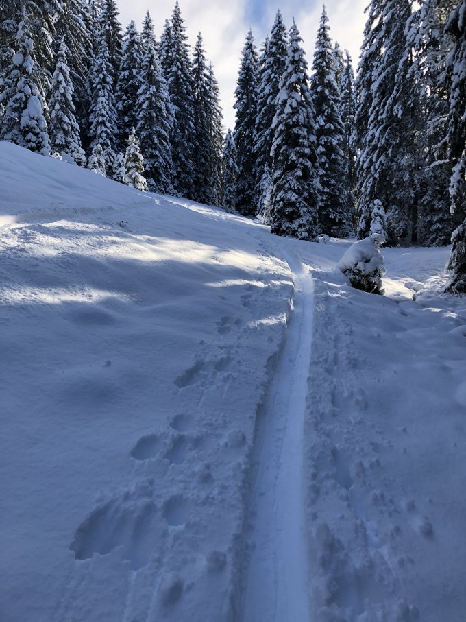 Gipfel bis Oberwandli tiefer Powder, kaum Unterlage aber schon gut gesetzt. Von Oberwandli bis zur Passstrasse rasch abnehmende Schneemenge, aber mit etwas Umsicht auch ohne Steinkontakt machbar.