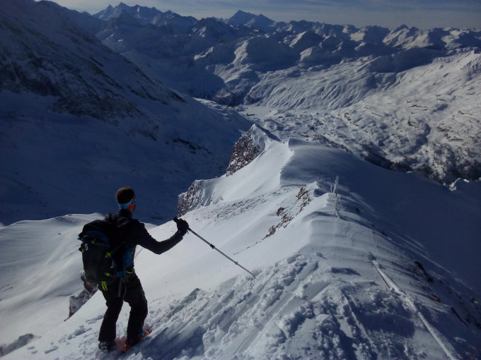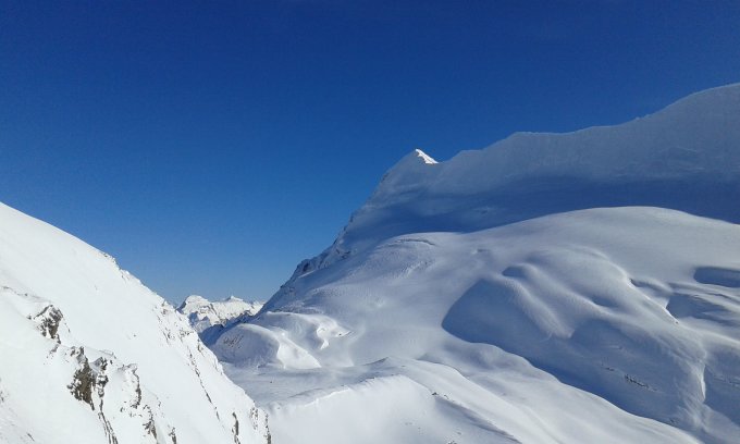 Aufstieg Normalroute vom Simplonpass zuerst Ri Breithorn, dann links ab Route 44a. Hart, abgeblasen. Abfahrt Couli dann perfekte Verhältnisse, oben windgepresste 20cm, je tiefer, desto mehr davon Pow. Unten raus hatte es bis ca. 2100m reingeregnet, dann tragend gefroren, danach 5-10(+)cm Neuschnee - wie auf einer Piste zu fahren.