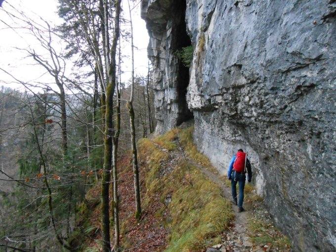 Von der Rappenlochbrücke über den Wassermannweg bis zur Spätenbachalpe war es nass und machmal sumpfig. Abschüssige Passagen erforderten Vorsicht. Bei der Spätenbachalpe war es angezuckert, beim Einstieg zum Fensterliwand-Steig hatte es fast eine geschlossene Schneedecke. Der Aufstieg bei diesen kombinierten Verhältnissen war eine durchaus ernste Angelegenheit. Vor uns hatte es keine Spur. Es war fest die ganze Zeit bedeckt und die Temperaturen waren leicht über dem Gefrierpunkt.