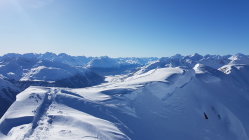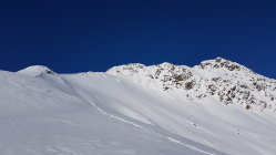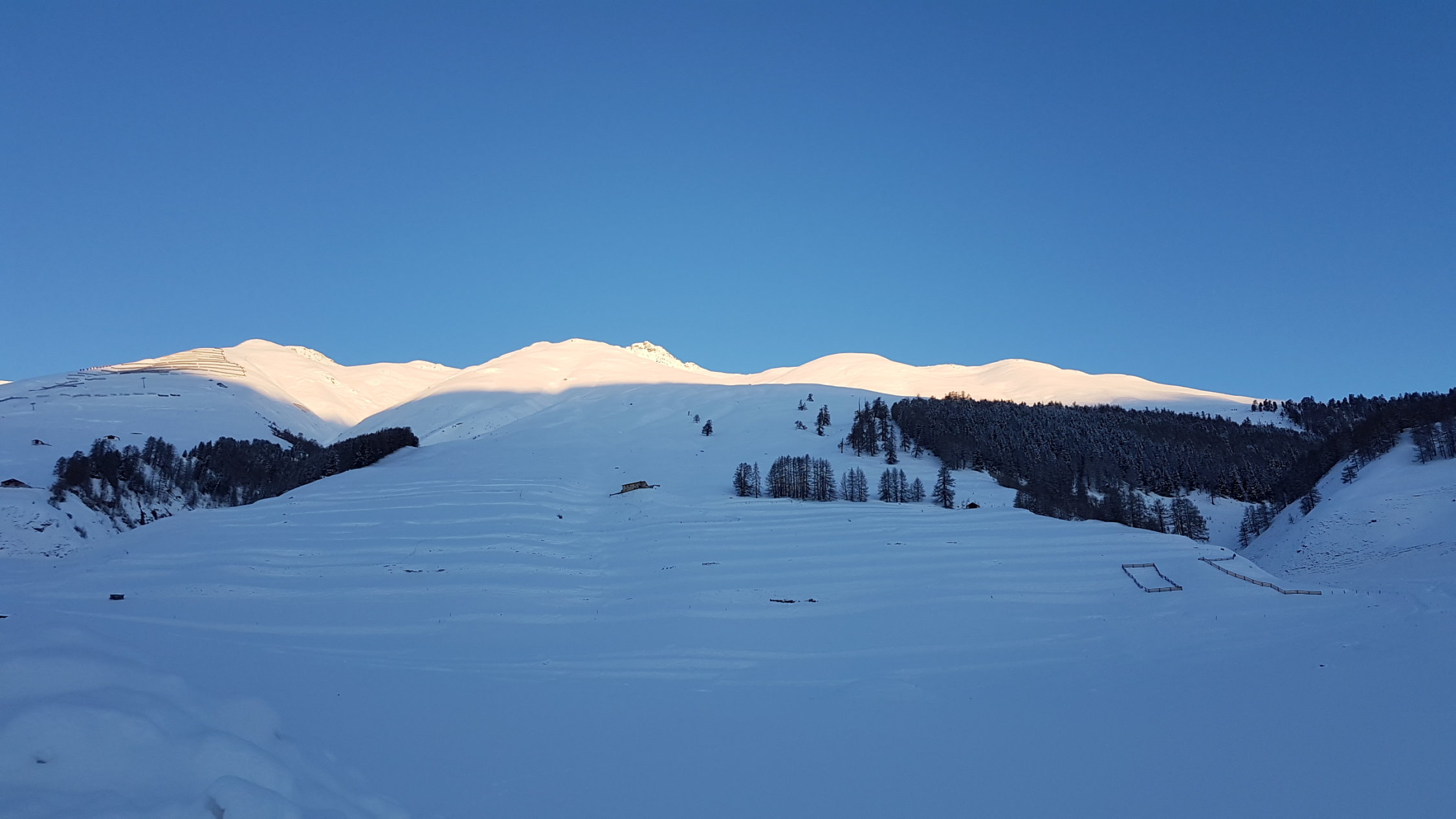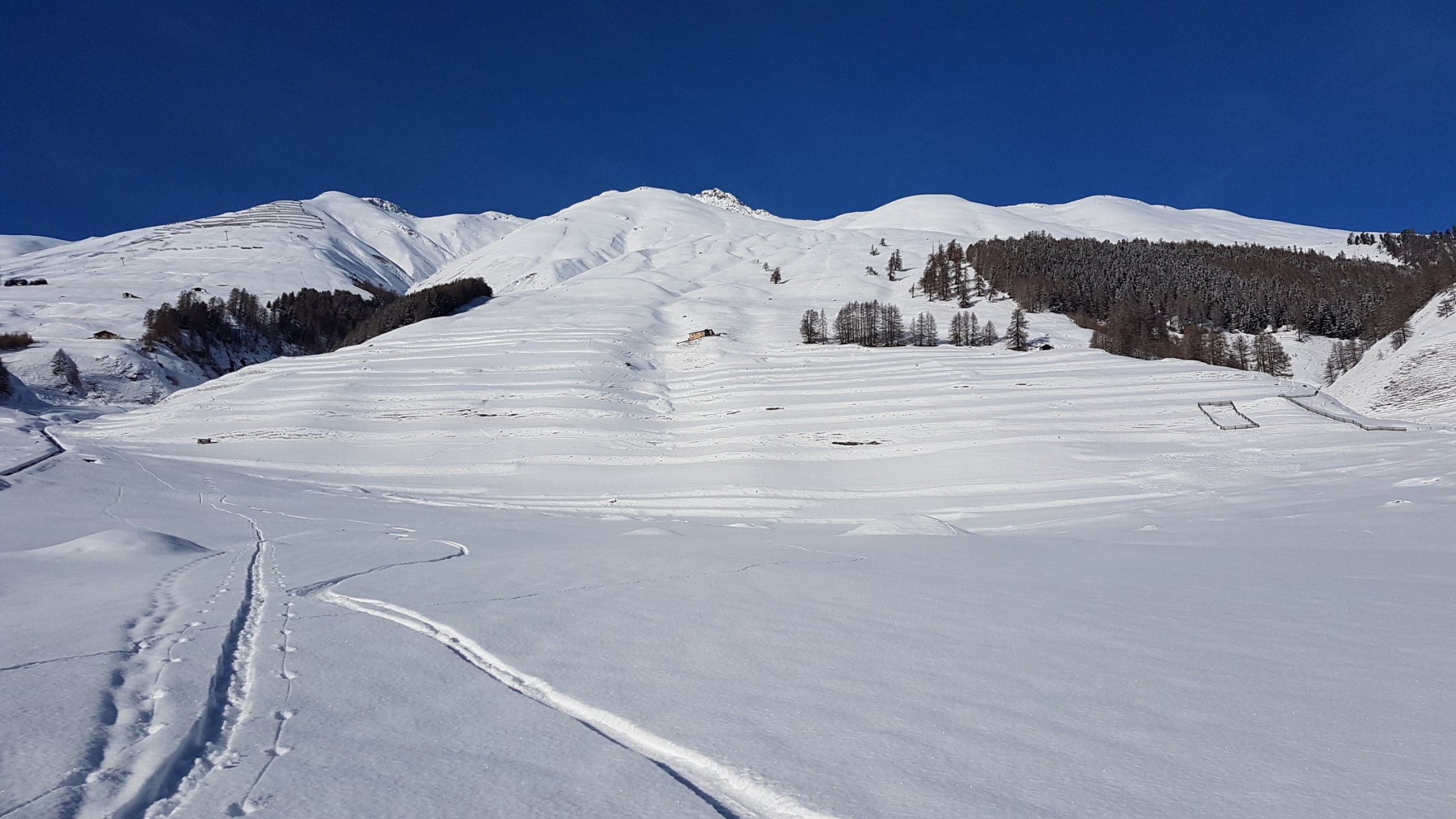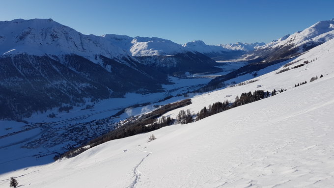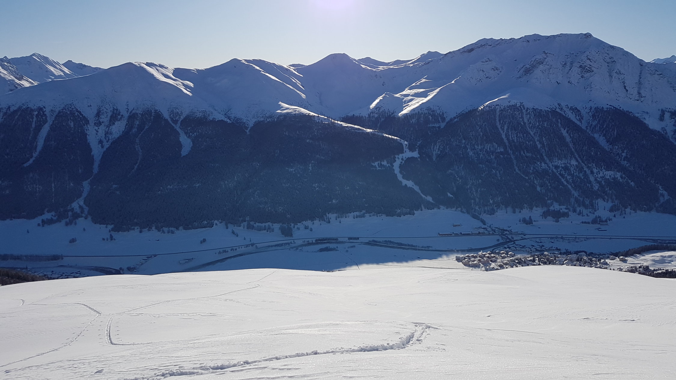 Bin heute trotz -15°C um 8:10 beim alten Flablager zwischen Zuoz und S-chanf gestartet. Gipfel war bereits im Sonnenlicht.Trotzdem war ich nicht der erste am Berg, kurz oberhalb Arets fuhr Hans schon den Hang runter. Um die Zäune im Gebiet Arets zu umgehen muss man entweder ganz rechts bei den Tannen, oder links noch mehr das Tal hoch gehen. Bin ziemlich direkt den Hang hoch bei sehr guten Bedingungen, 10-20cm Neuschnee. Gipfelhang ist mit den Skiern nicht ganz einfach hoch zu kommen.