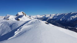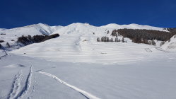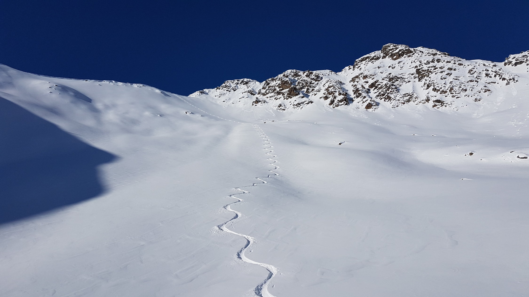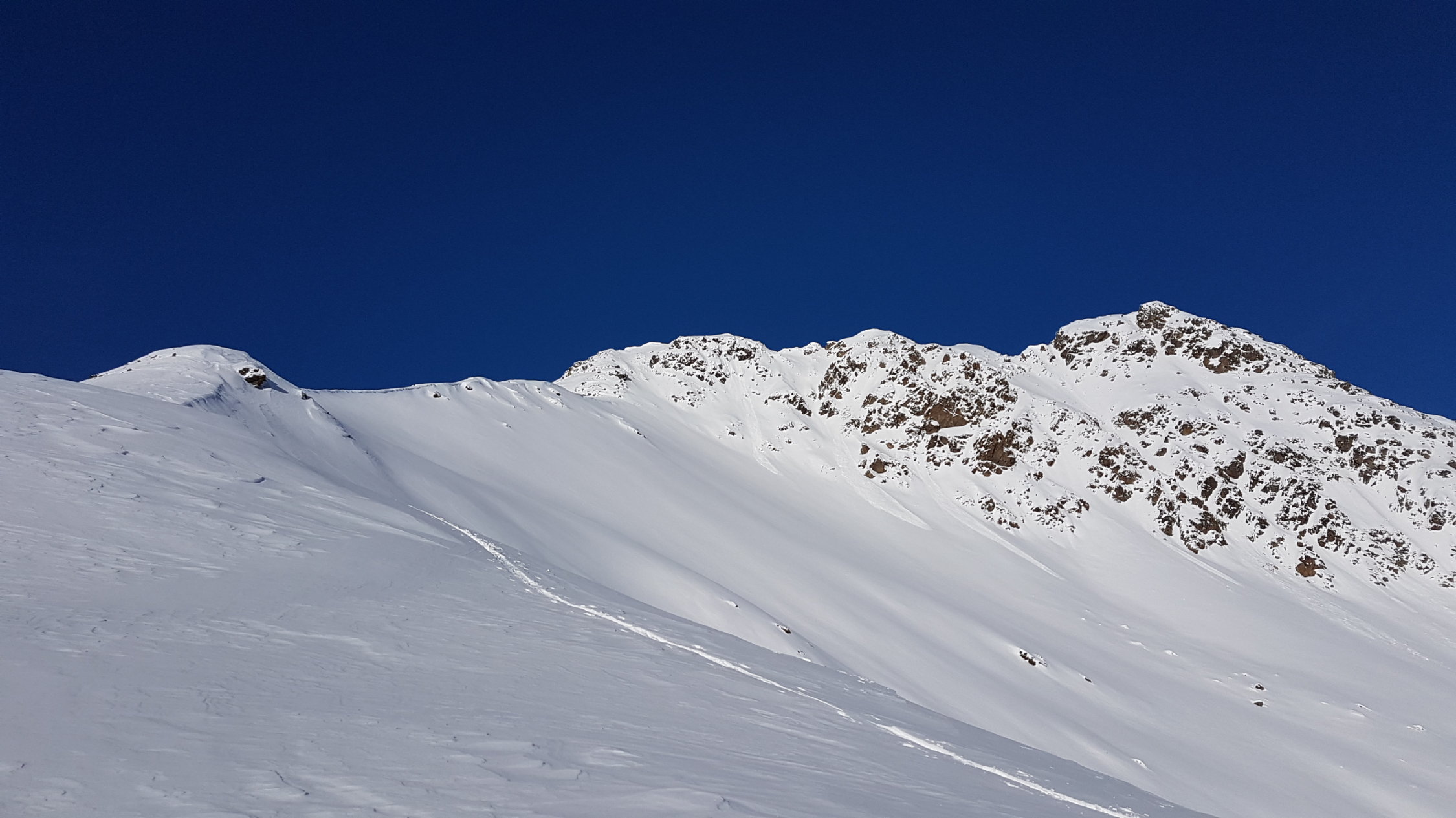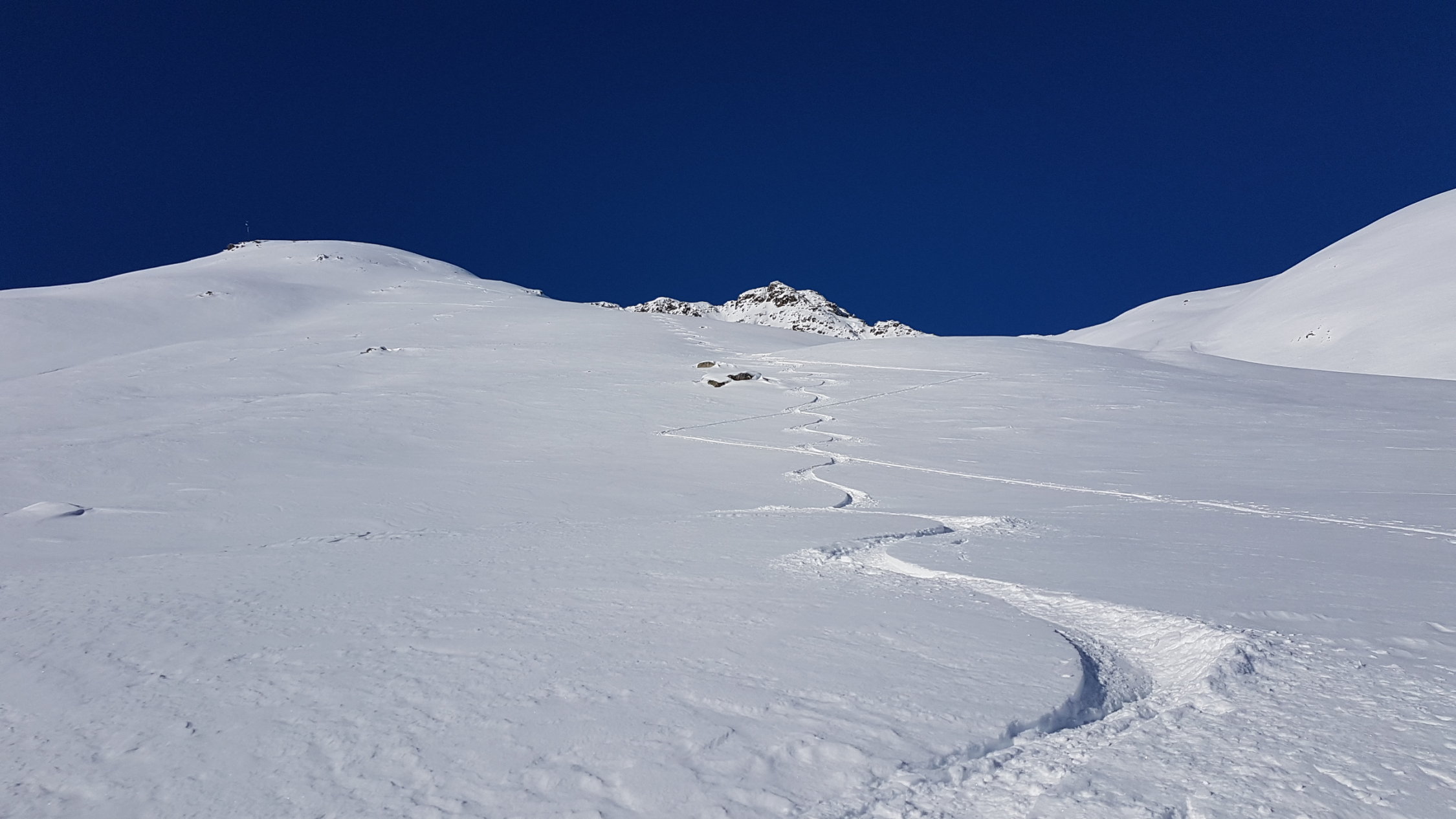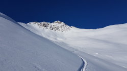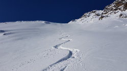 Abfahrt: im Gipfelhang sind die Steine zum Teil nur mit dem Neuschnee bedeckt und sind kaum sichtbar. Nicht ideal, mit den Skiern runter zu fahren. Habe schon im Aufstieg den Osthang angeschaut, war mir aber noch nicht sicher, ob und wo man hineinfahren kann. Schnee war pulvrig und kaum verblasen. Bin dann doch schon weiter oben rein gefahren als ursprünglich gedacht und es waren super Verhältnisse. Es war eine geniale Abfahrt mit Pulverschnee bis ganz unten. Einzig im untersten Teil wird die Unterlage etwas holprig