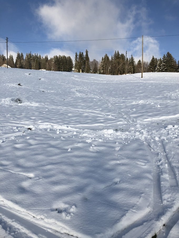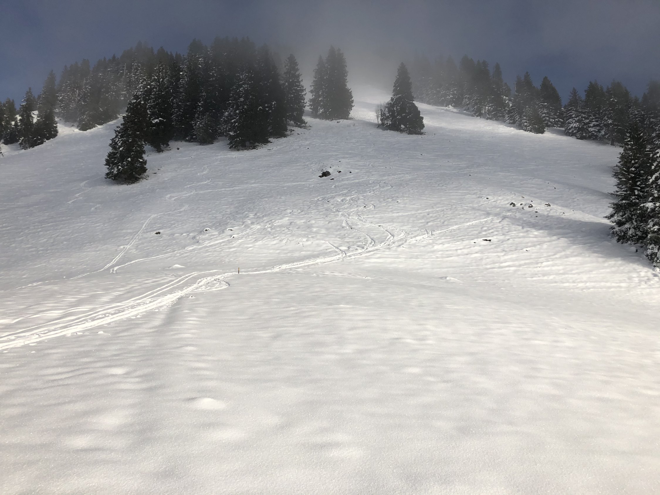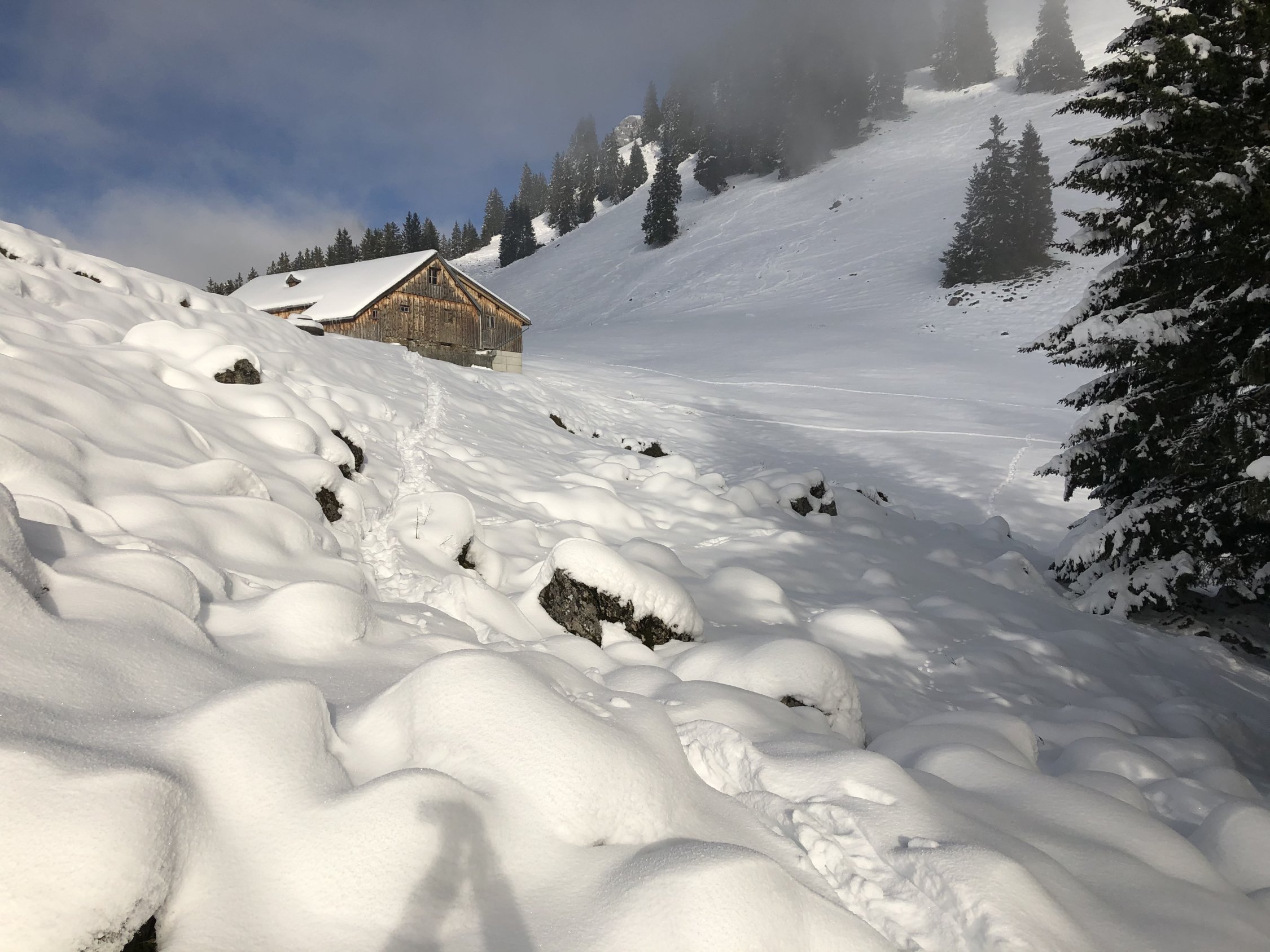 Start heute beim Parkplatz Tscherwald. Ab hier durchgehende Schneedecke. Aufstieg wunderbar sonnig und angenehm mild. Ab dem Vorgipfel kalt mit starkem Nordostwind. Gipfelhang in der Abfahrt technisch anspruchsvoll, aber erstaunlich wenig Bodenkontakt. Sah im Aufstieg schlechter aus. Bin heute nach Hüttlisboden zuerst rund 100 Höhenmeter Richtung Tal abgefahren und dann auf dem Wanderweg durch den Wald zum Hohlweg gequert, um den Steingarten auszulassen.
