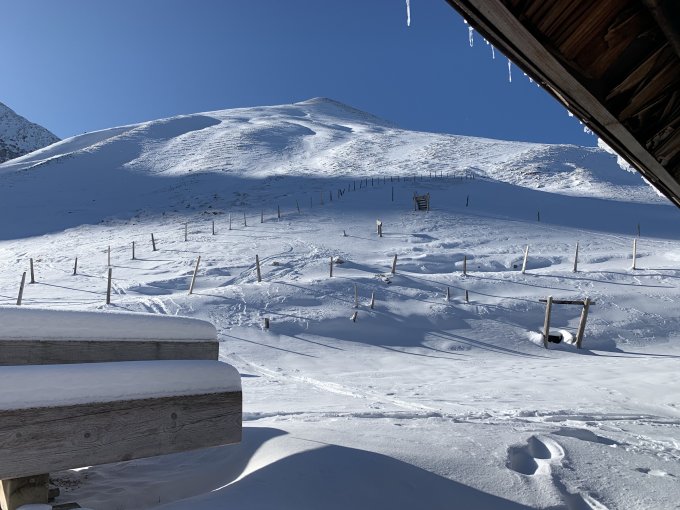 fahrbar in den Rinnen und nachher auf der Alpstrasse ohne Steinkontakt, Hartschnee, Bruchharst, Pulver, Eisgras...