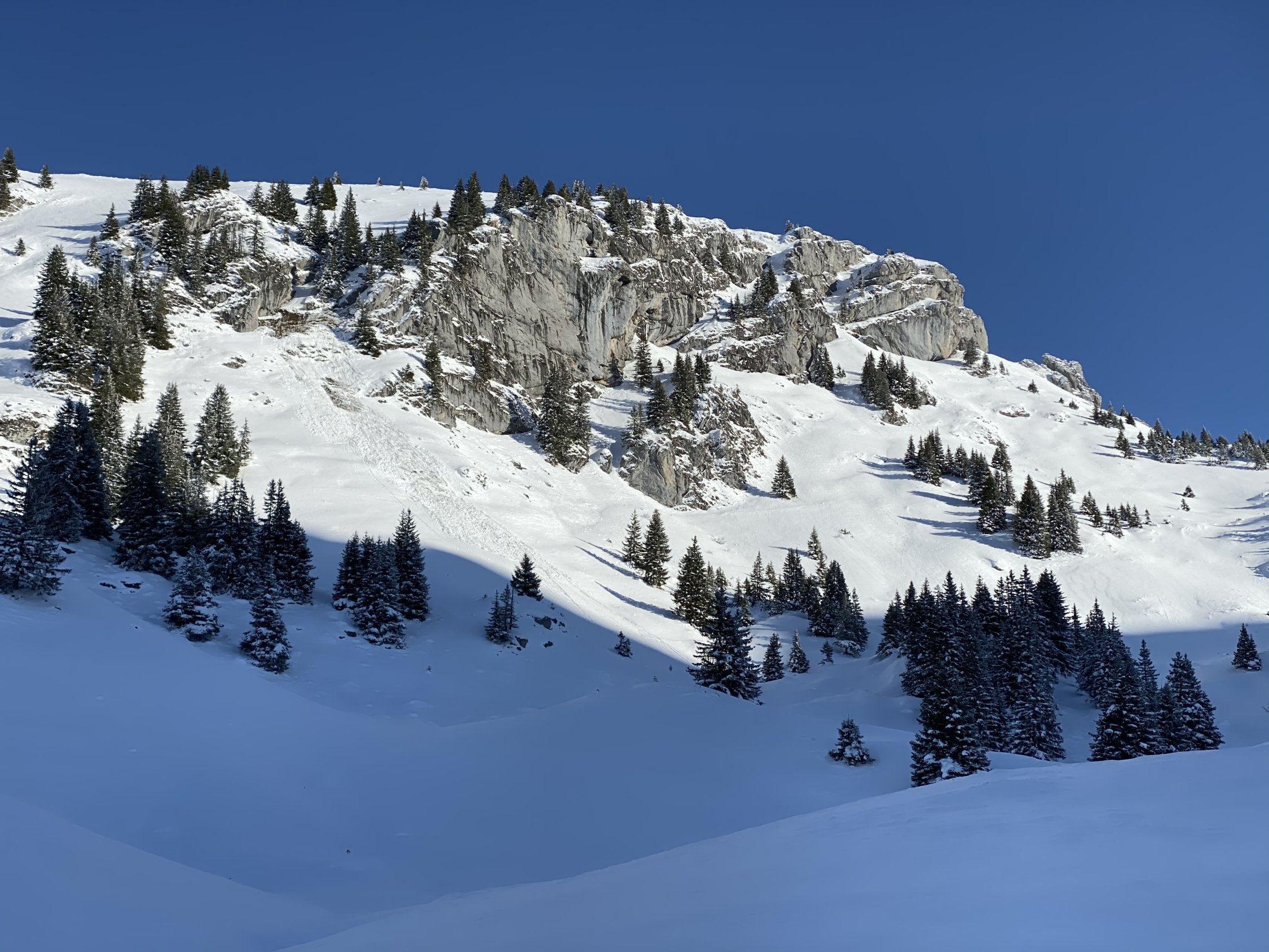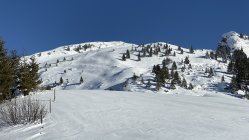 So zwischen 1400/1450 m darf man guten Gewissens im Aufstieg die Ski anlegen, in der Abfahrt etwa bis 1550 m (man hört’s, wenn‘s Zeit wird abzuschnallen).