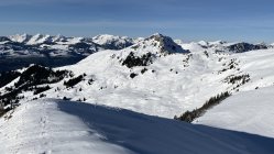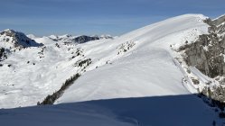 Im oberen Drittel der Tour ist der Schnee dann abschnittsweise sogar sehr schön, fast noch pulvrig. Was wohl dem Wind und Triebschnee zu verdanken ist. Unmittelbar auf dem Grat ist es recht abgeblasen, die Westflanken sind gut gefüllt.