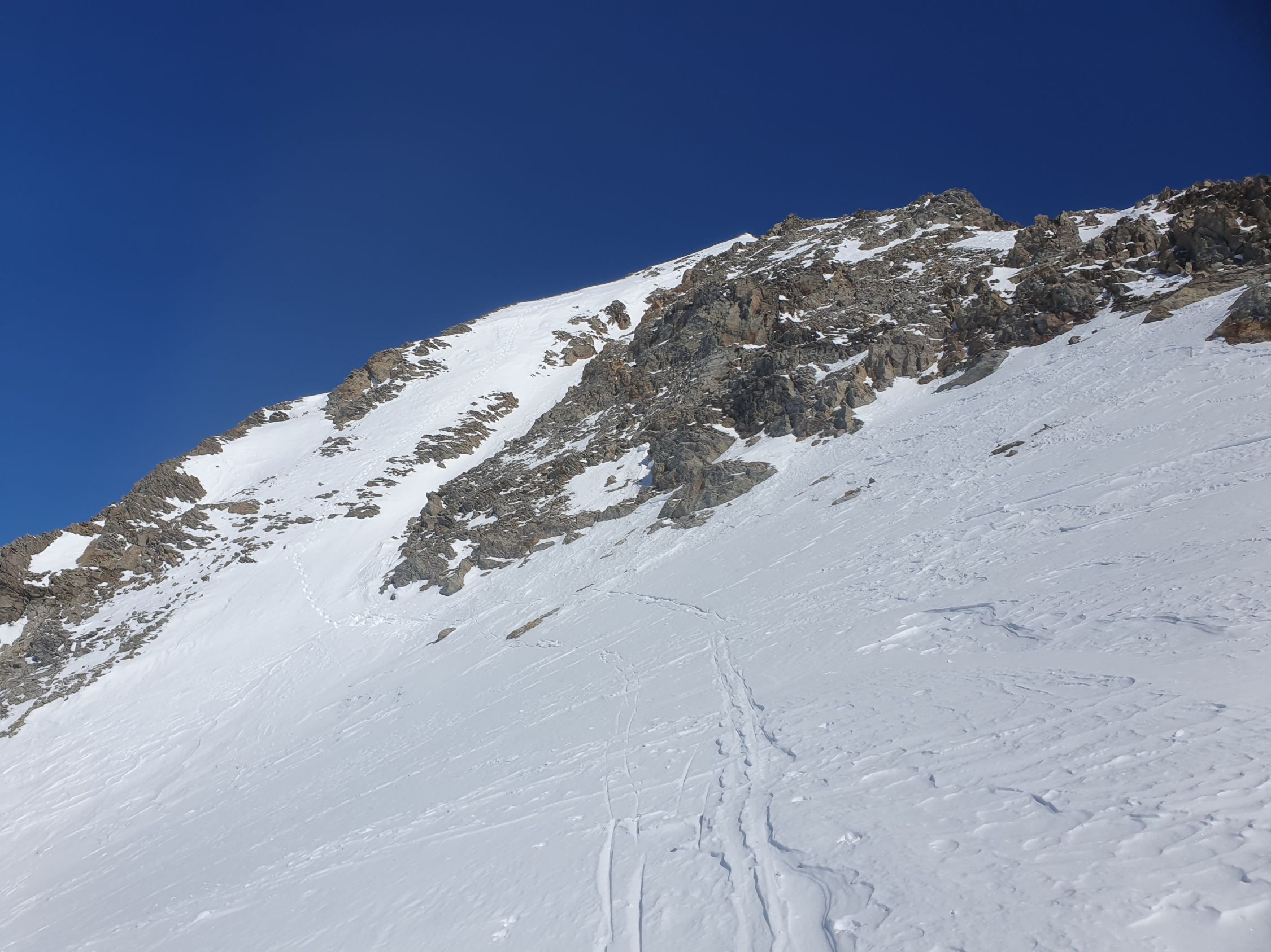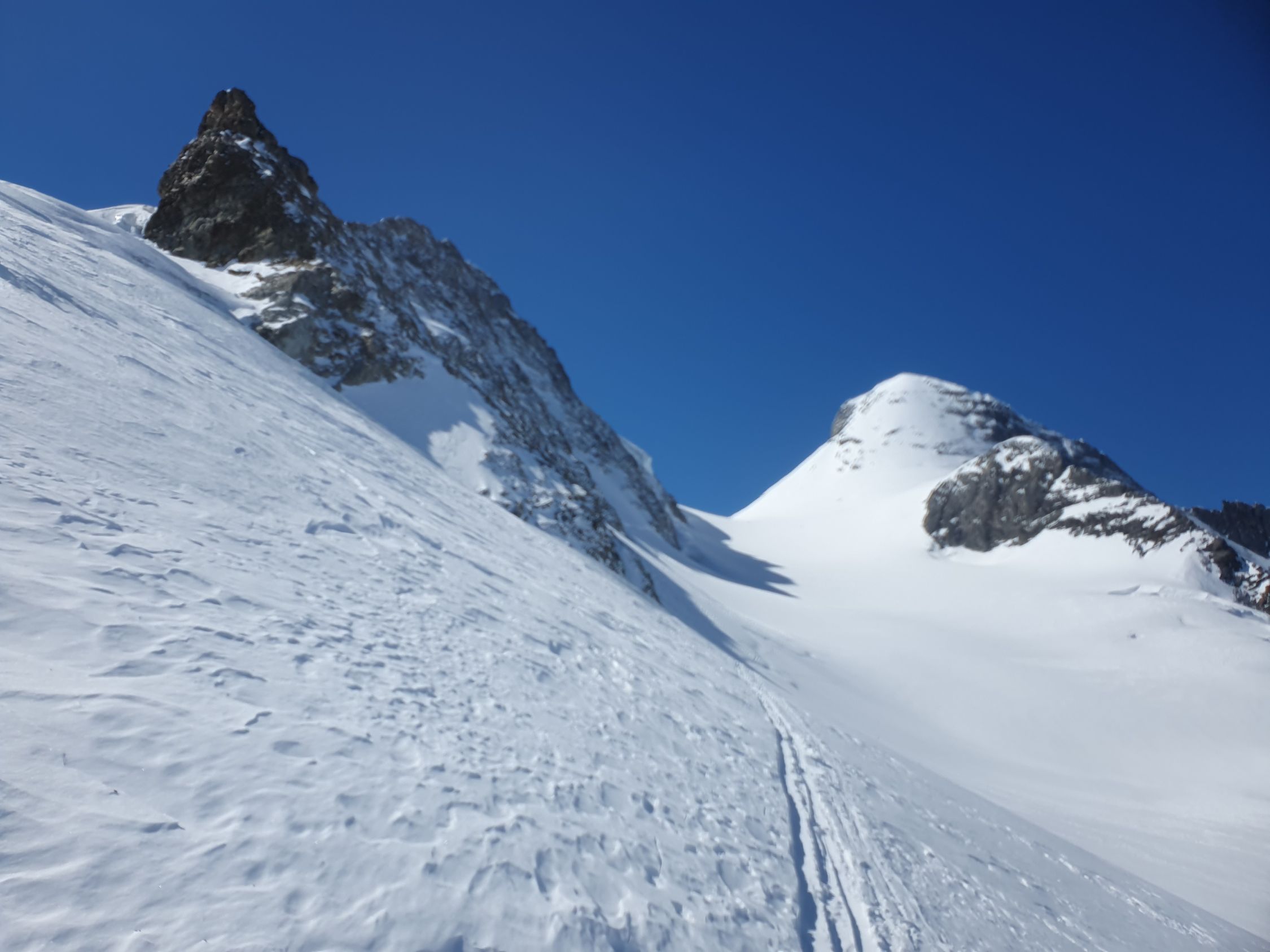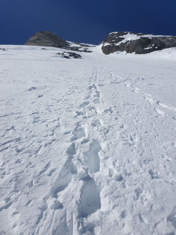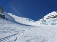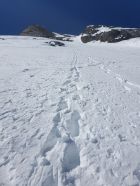 Der Rosenlauibiwak war besucht und wies von dort aus ebenfalls viele Spuren auf. Der Rosenlouwigletscher ist perfekt eingeschneit und weist eine gute sulzige Spur auf. Nach der Ebene geht's bei 2800Hm sehr steil auf einer gut griffigen Spur hoch. Dann traf ich eine eingewindete Spur über Zastrugi weiter zum Wellhornsattel. Hier nördlich um die Eisfläche herum und auf Hartschnee mit möglichst wenig Höhenverlust unter den Felsen von P3369 in Richtung W.