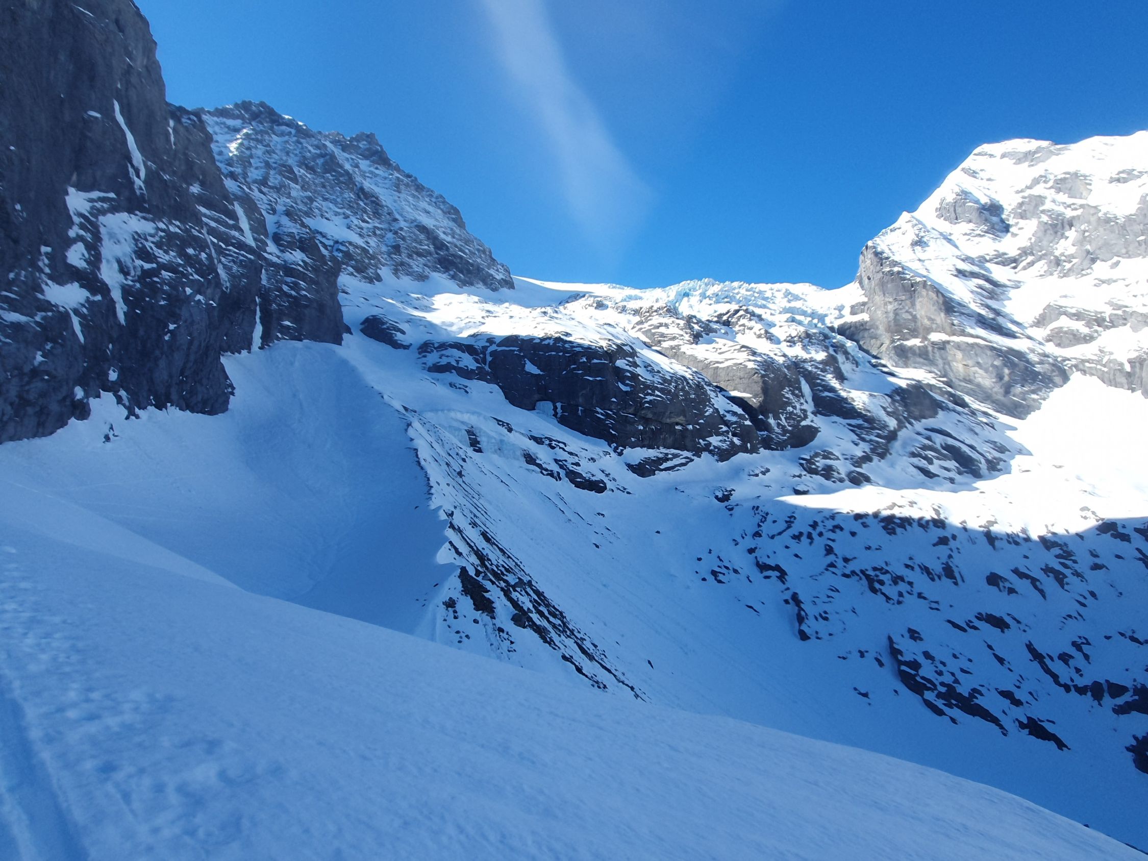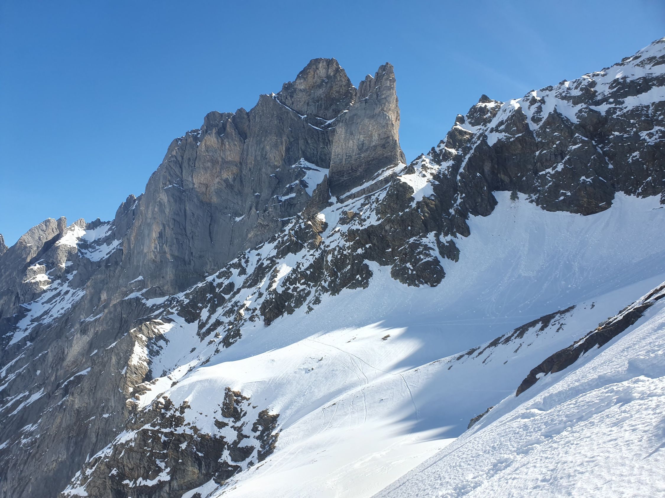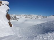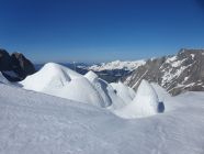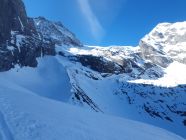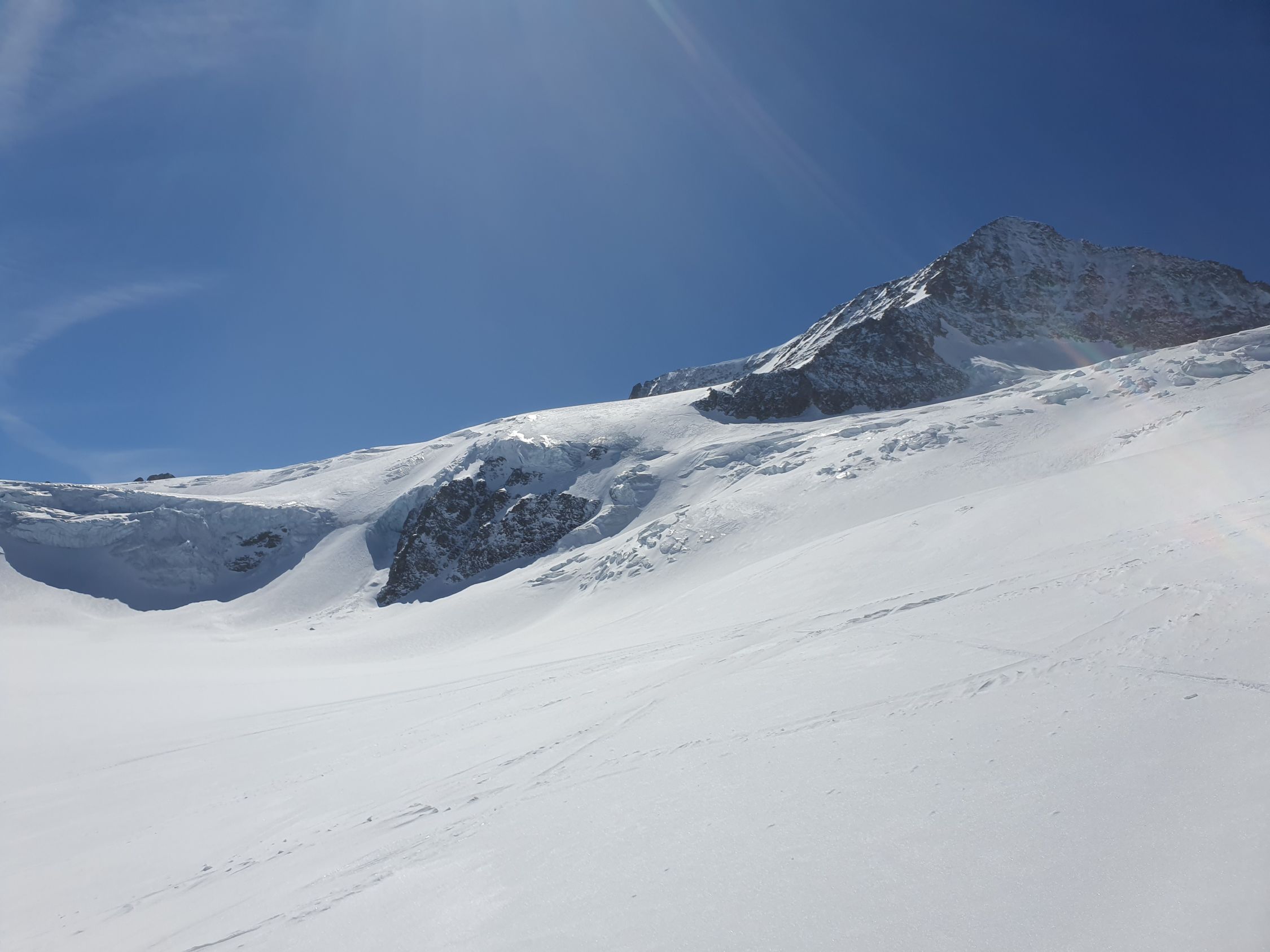 Der Rosenlauibiwak war besucht und wies von dort aus ebenfalls viele Spuren auf. Der Rosenlouwigletscher ist perfekt eingeschneit und weist eine gute sulzige Spur auf. Nach der Ebene geht's bei 2800Hm sehr steil auf einer gut griffigen Spur hoch. Dann traf ich eine eingewindete Spur über Zastrugi weiter zum Wellhornsattel. Hier nördlich um die Eisfläche herum und auf Hartschnee mit möglichst wenig Höhenverlust unter den Felsen von P3369 in Richtung W.