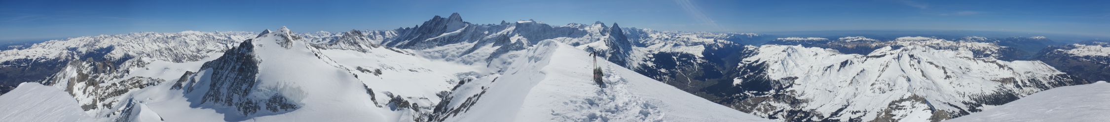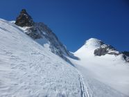 Ich schaffte es beim Wetterhorn mit Ski bis 3505Hm und machte dann Skidepot. Mit Steigeisen, Pickel und Stock geht's auf ca. 45° hoch zum Wetterhorn. Es hatte hier sogar eine Skiabfahrtsspur drinnen.