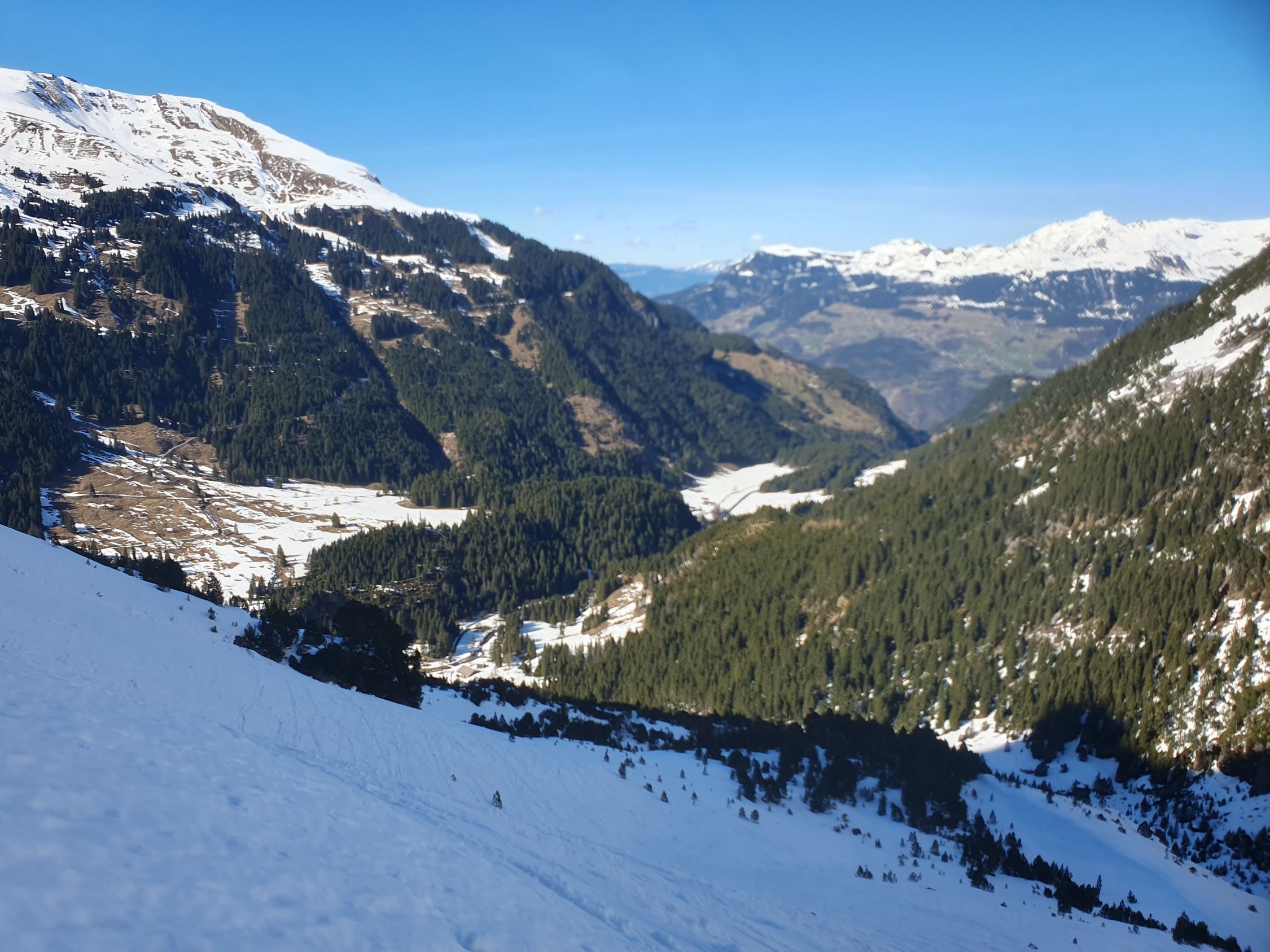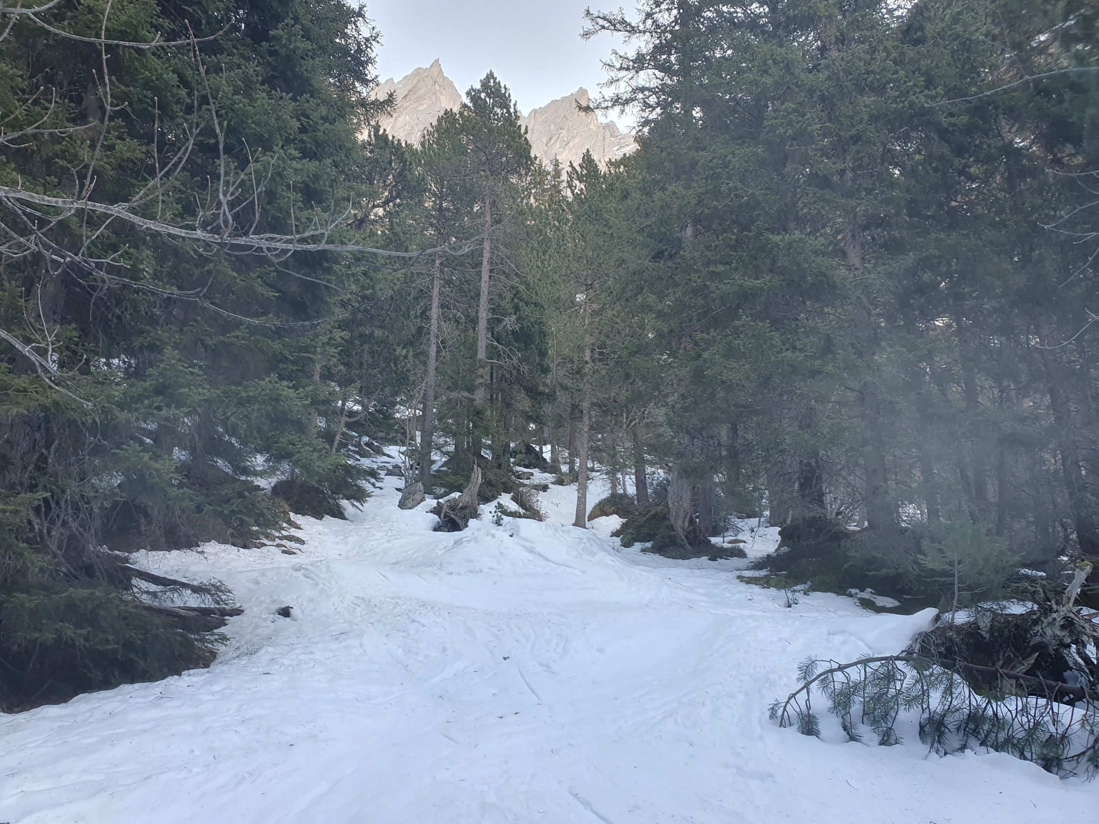 Die Abfahrt vom Skidepot Mittelhorn pickelhart. Dann auf Hartschnee zum Wellhornsattel und sehr mühsam über die harten Zastrugi hinab zur steilen Passage, wo ich im Bruchharsch kam. Auf dem Rosenlouwigletscher fand ich Sulz und weiter unten Nassschnee. Für die Abfahrt wählte ich die westliche Variante über P2012. Hier hatte es oben, nahe der Abzweigung der Aufstiegsroute, eine kurze, aber sehr steile Passage, die mit Ski seitlich hinab gelaufen werden muss. Zuunterst im Wald schmilzt der Schnee relativ schnell. Die kommenden Schneeprognosen werden aber die apere Stellen schnell wieder füllen.