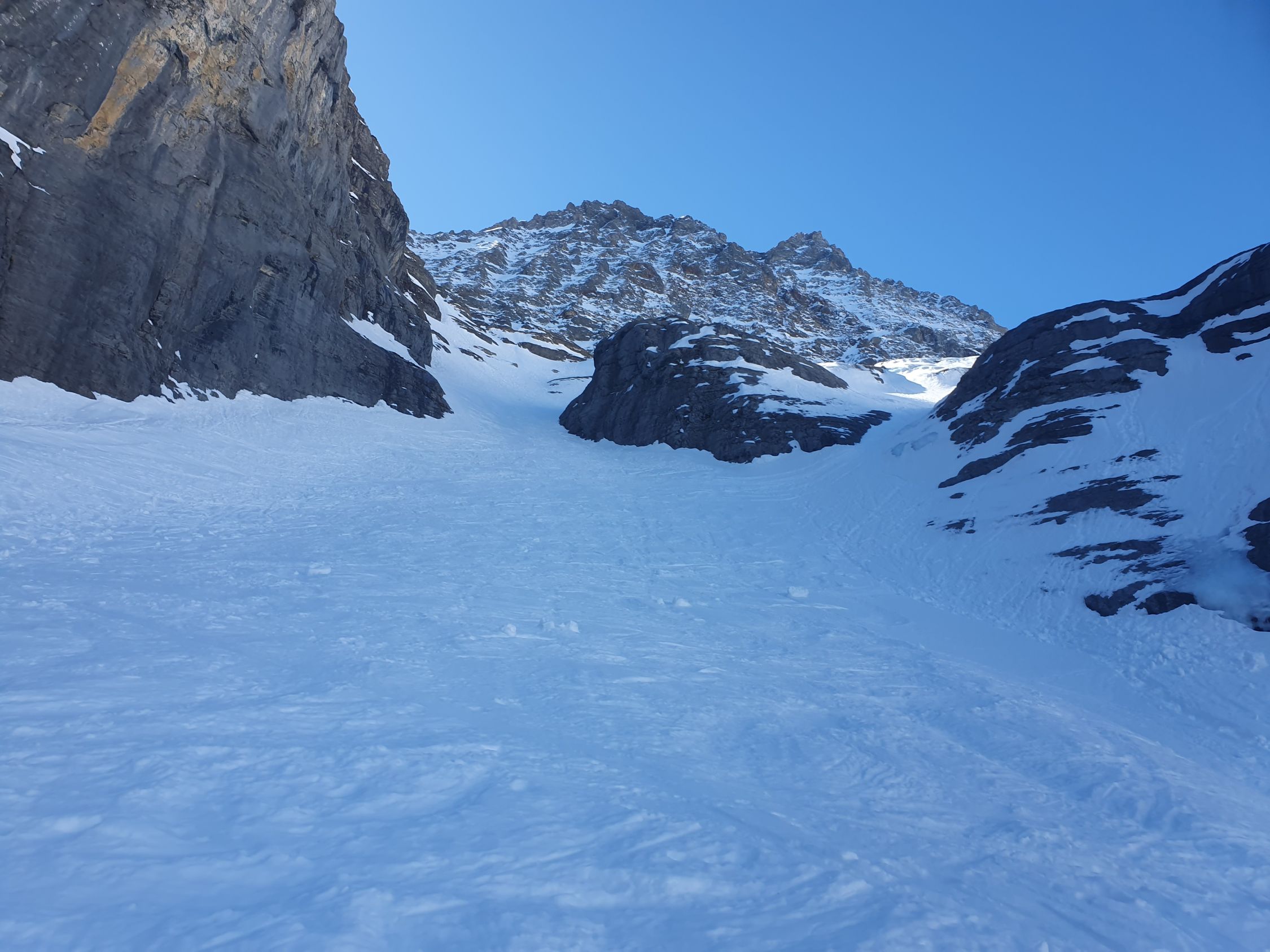 Ab Gletscherhubel traversierte ich ein paar Nassschneelawinen und kam so auf eine glasige Spur bei 1900Hm durch die Moräne zum Steilhang vor dem Dossenweg. Hier lasse ich dummerweise die Harscheisen noch immer im Rucksack und rutsche immer wieder etwas ab, v.a. beim steilen Ausstieg.